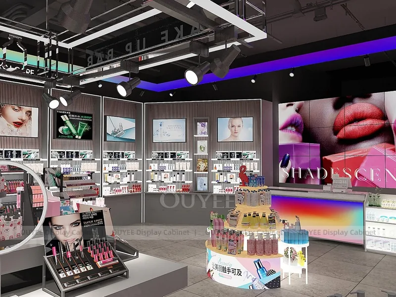 This configuration works well for cosmetic shops, makeup boutiques, beauty chain stores, department-store counters, and branded retail interiors. It is suitable for cosmetic store openings, beauty shop renovations, department-store counter upgrades, pop-up retail projects, and custom display fixture programs that need consistent production quality.