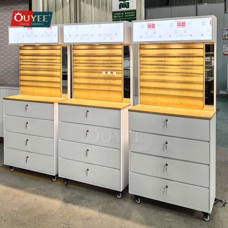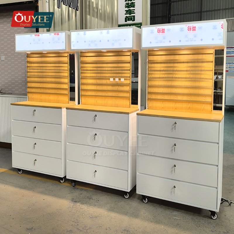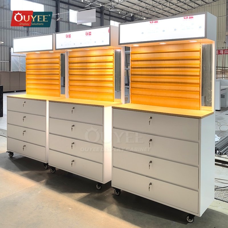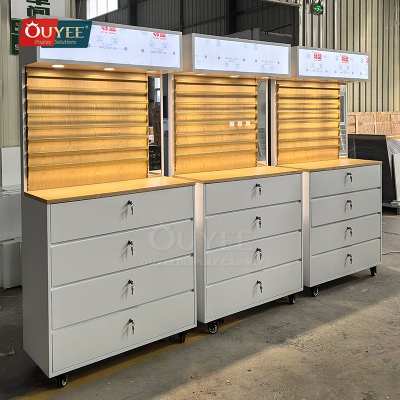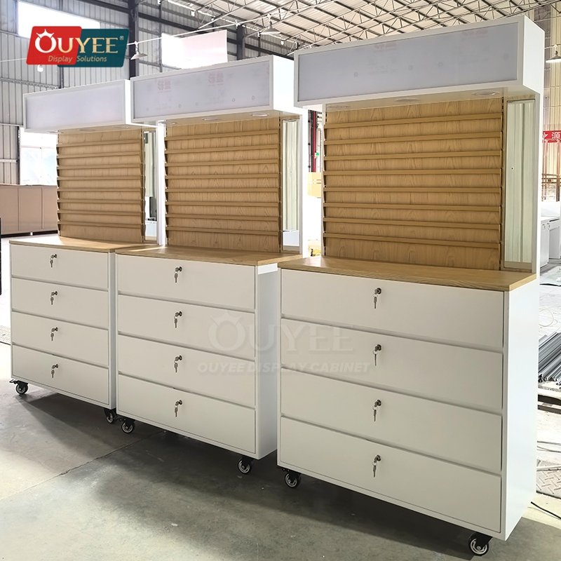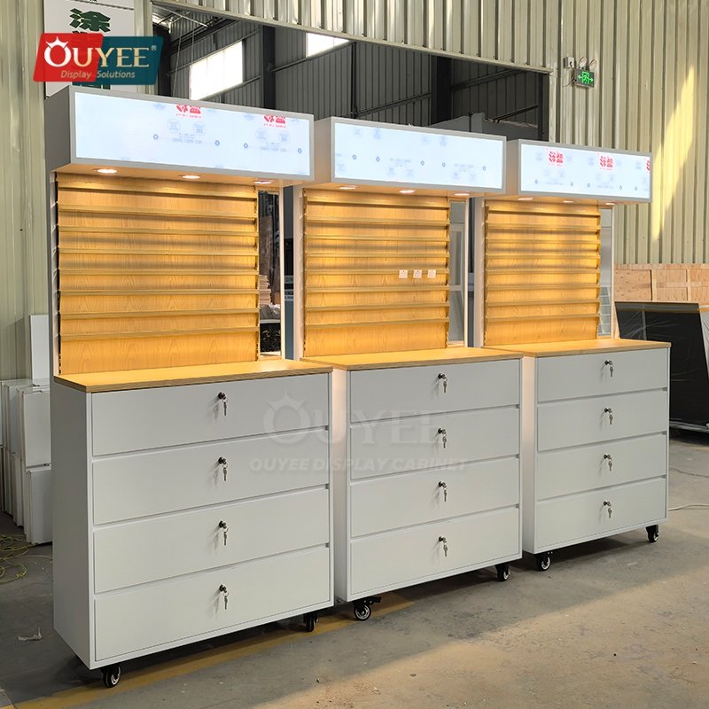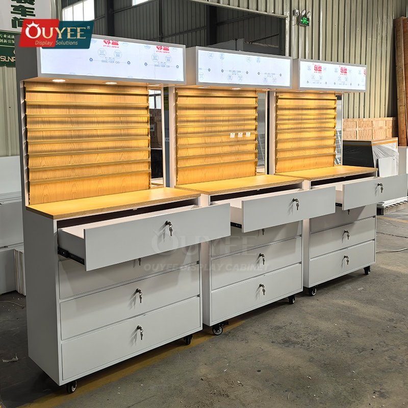 OUYEE can produce this model with metal framing, integrated LED lighting, and practical storage drawers. Depending on project needs, we can adjust dimensions, shelf spacing, accessory modules, finish tones, graphic areas, and lighting details so the fixture fits the brand language and the available floor plan. For related inspiration, you can also browse wall display ideas and our store fixture manufacturing capabilities.