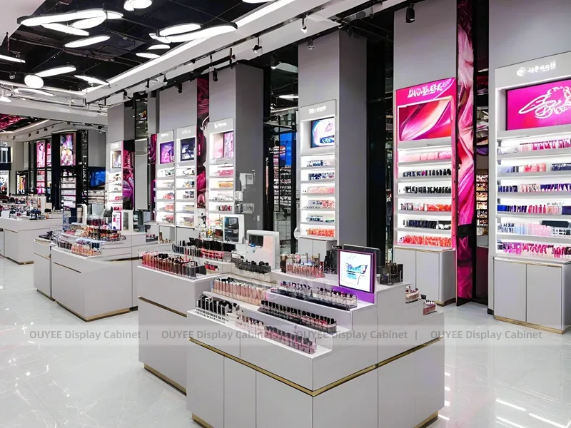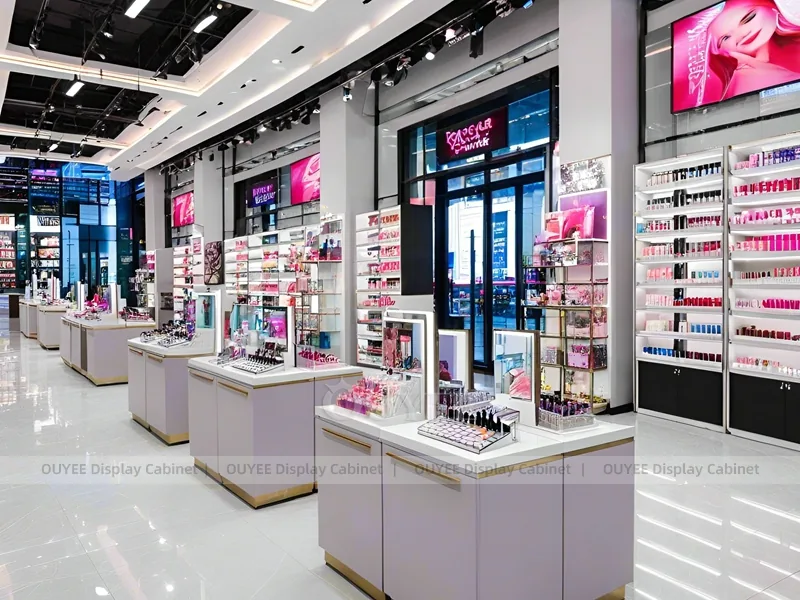 This configuration works well for cosmetic shops, makeup boutiques, beauty chain stores, department-store counters, and branded retail interiors. It is suitable for cosmetic store openings, beauty shop renovations, department-store counter upgrades, pop-up retail projects, and custom display fixture programs that need consistent production quality.