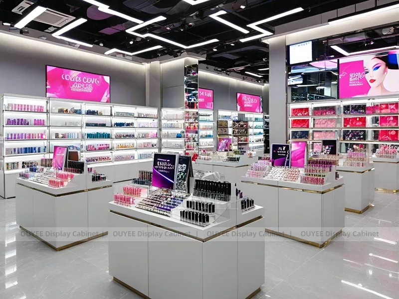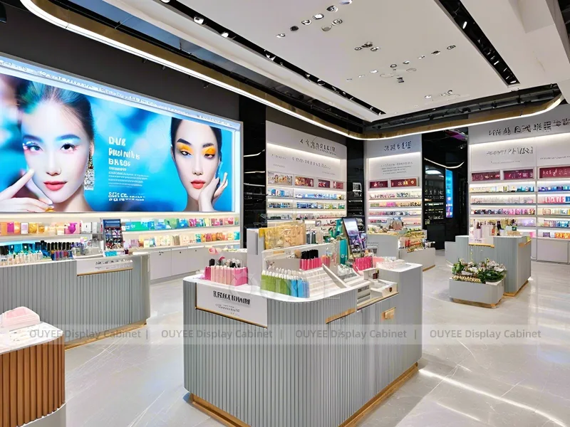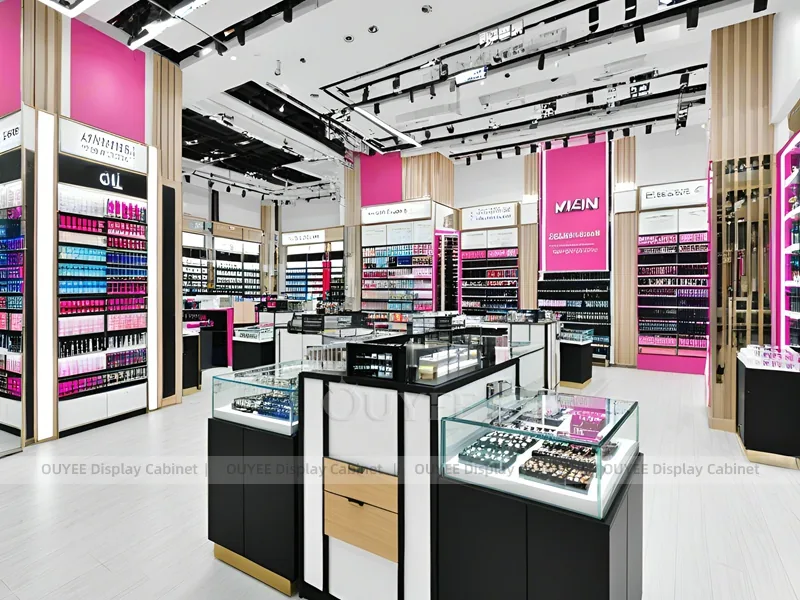 OUYEE can produce this model with custom color retail panels, durable shelving, metal supports, acrylic accents, and integrated LED lighting. Dimensions, finish colors, shelf depths, light boxes, tester trays, logo panels, storage modules, and counter details can be adjusted to match the store plan and brand identity. Related inspiration is available across display shelves, wall display, display counter, and our store fixture manufacturing service.