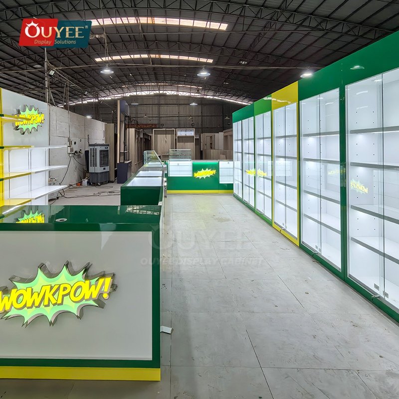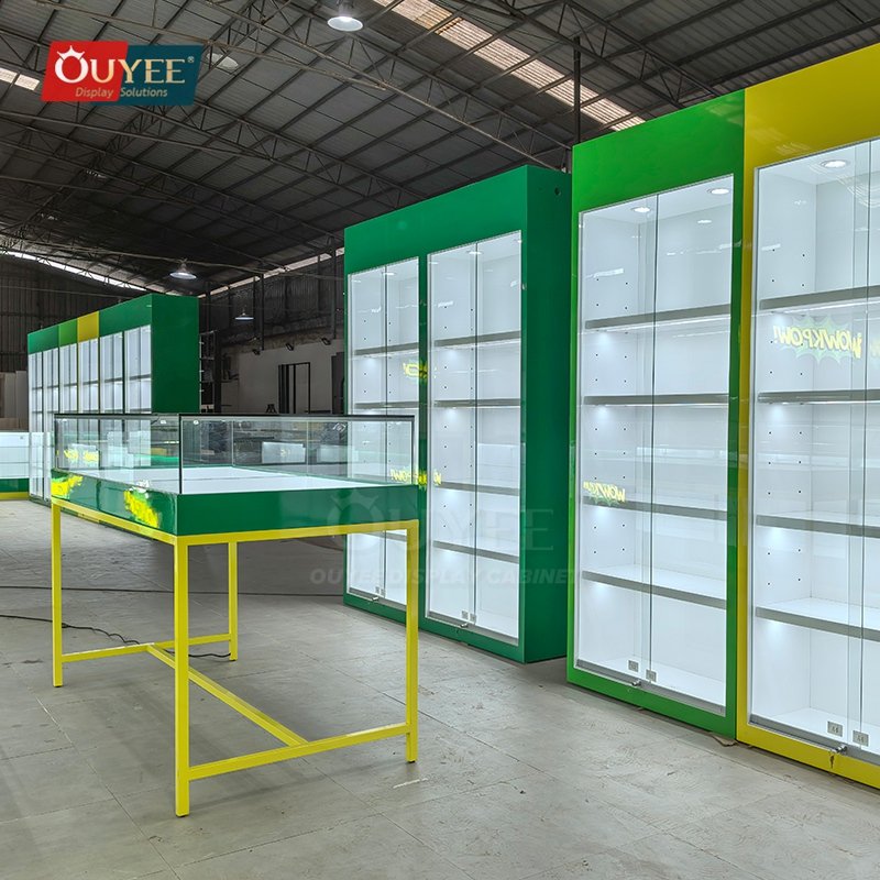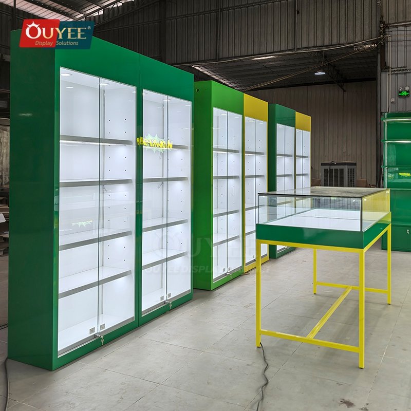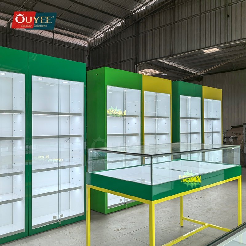 OUYEE presents a Green and White Retail Display Cabinet with Service Counter developed for jewelry stores, accessory boutiques, lifestyle shops, and premium retail interiors. This display cabinet blends showroom presentation, practical storage, and premium lighting details to help brands build a cleaner and more memorable retail environment. As a custom display cabinet solution, it can be adapted for different merchandising concepts, store footprints, and brand identities. You can also explore related inspiration on our display cabinet page, discover material options via materials, and learn how OUYEE handles custom production through our manufacturing service.