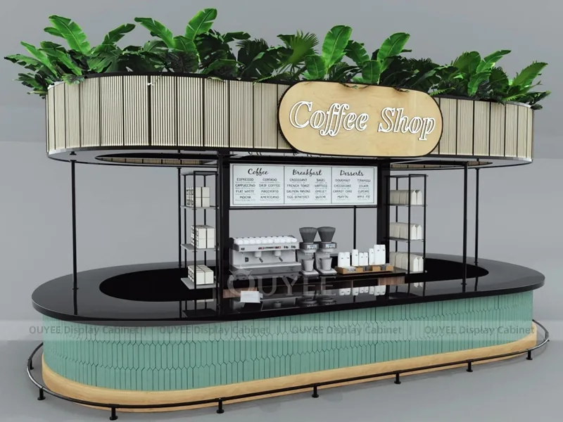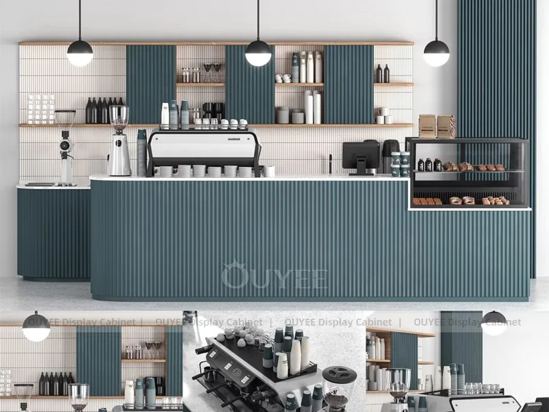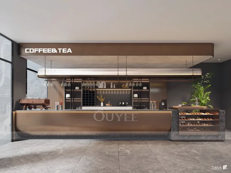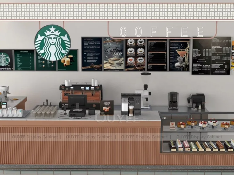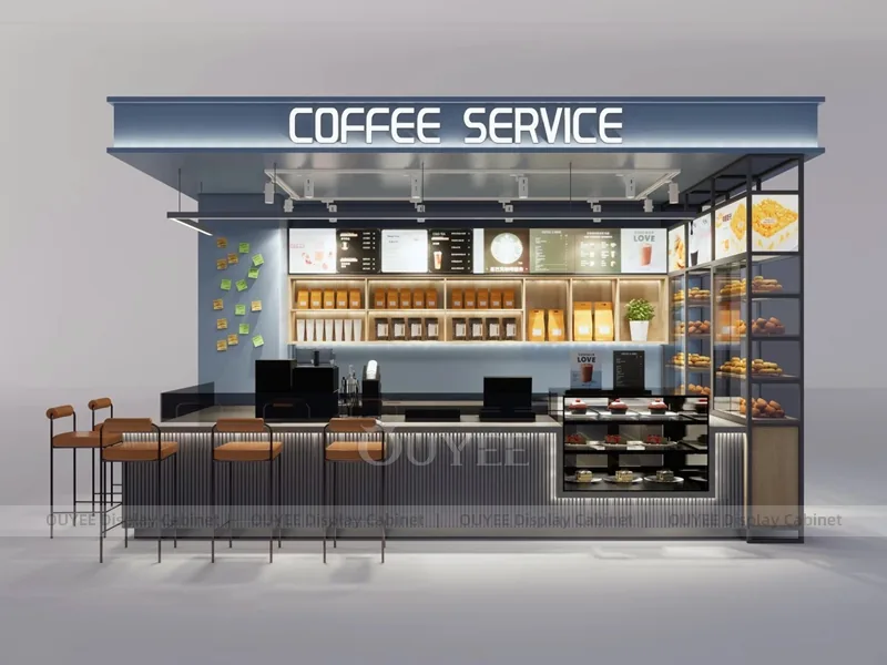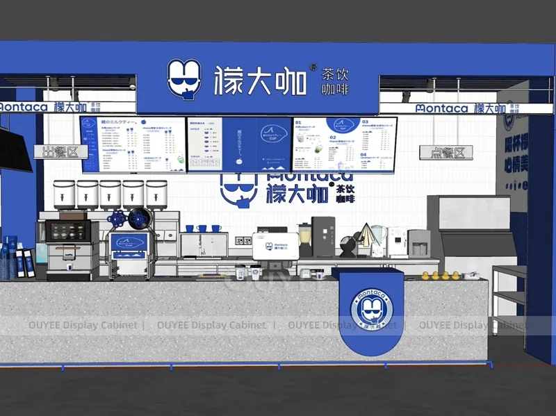 OUYEE can customize this model with custom color retail finishes and durable counter and storage modules. Store owners can adjust size, finish, layout, logo panel, counter height, storage structure, service opening, pickup area, cup storage, equipment clearance, menu areas, cup storage, topping display, lighting position, counter depth, and brand logo details to match the final shop drawing.