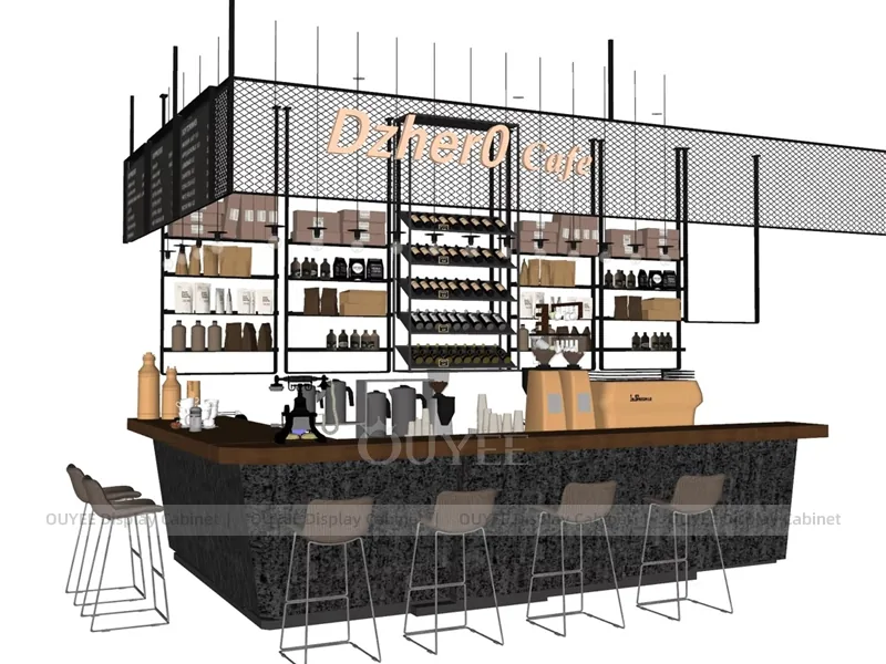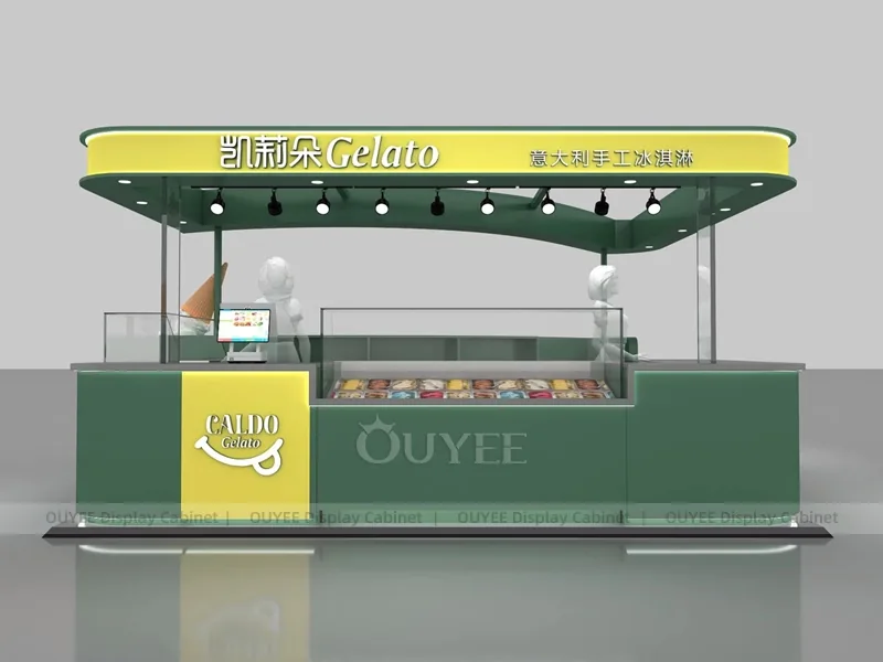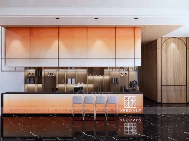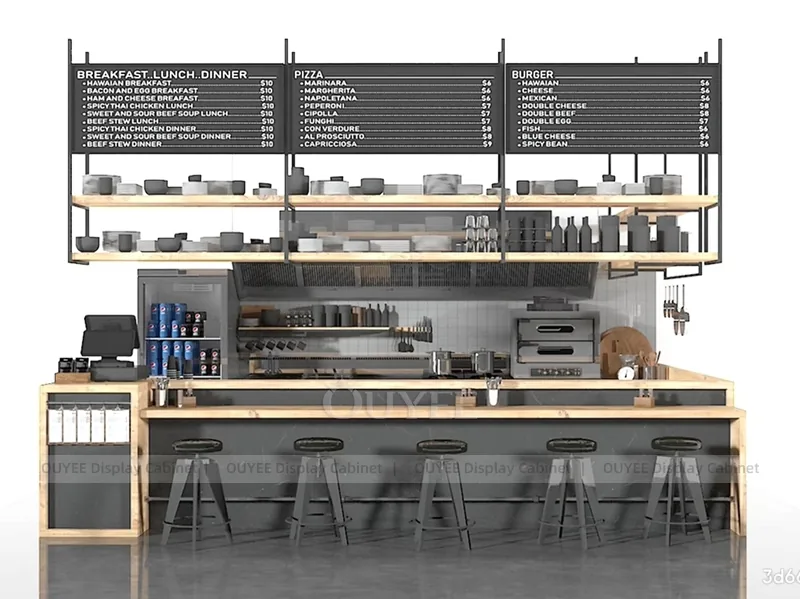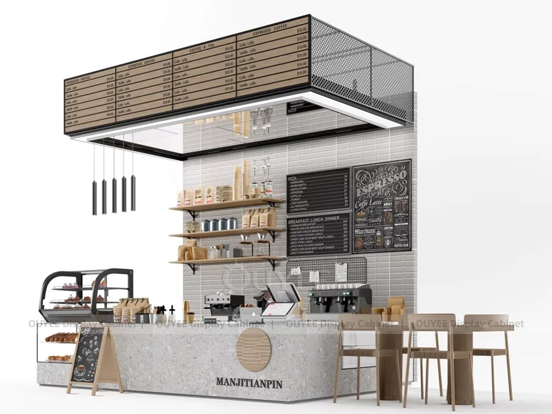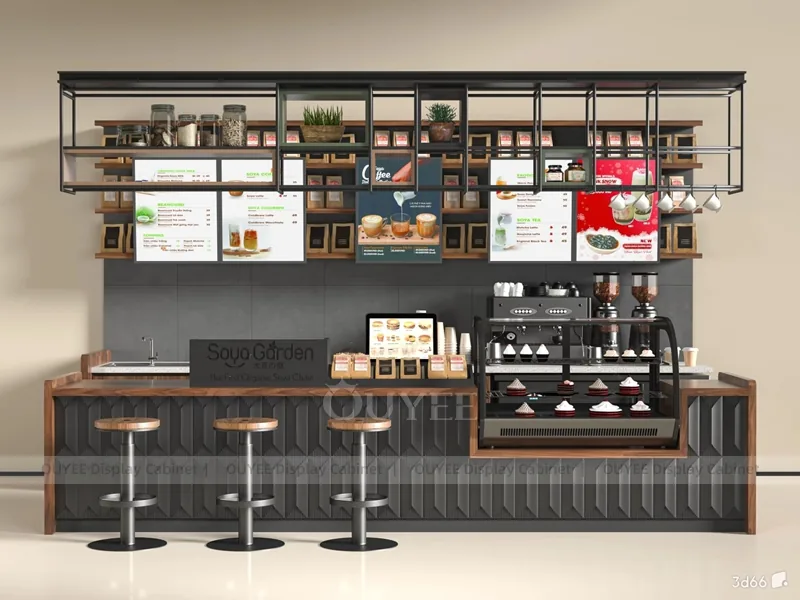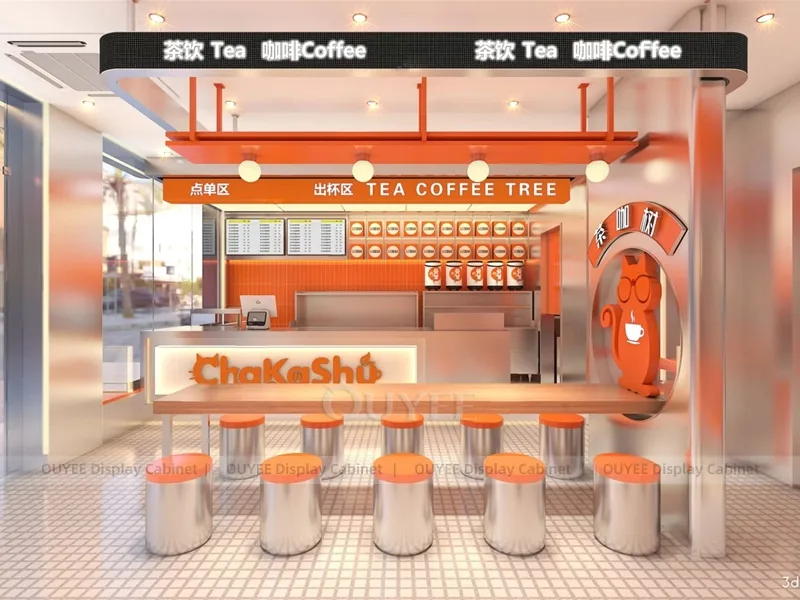 OUYEE can customize this model with custom color retail finishes and durable counter and storage modules. Store owners can adjust size, finish, layout, logo panel, counter height, storage structure, service opening, pickup area, cup storage, equipment clearance, menu areas, cup storage, topping display, lighting position, counter depth, and brand logo details to match the final shop drawing.