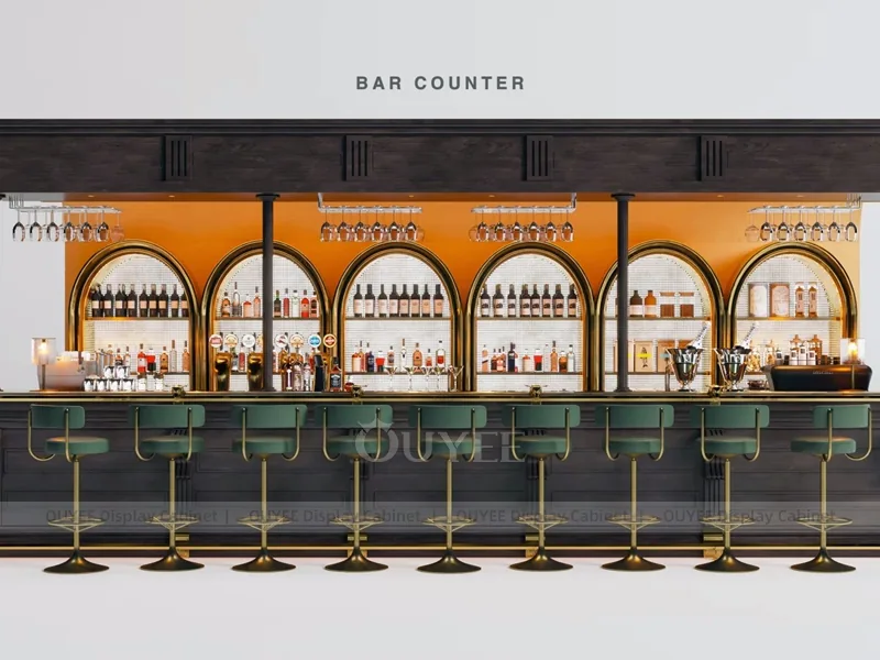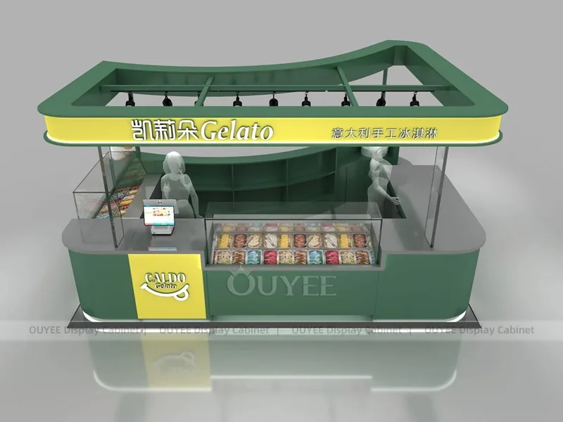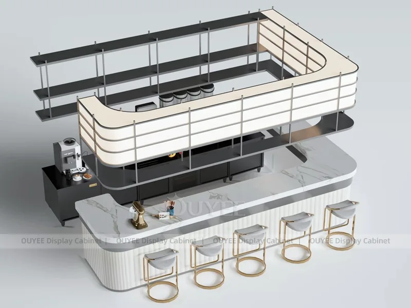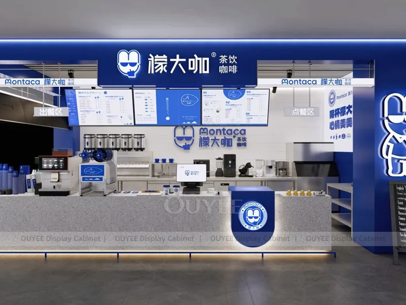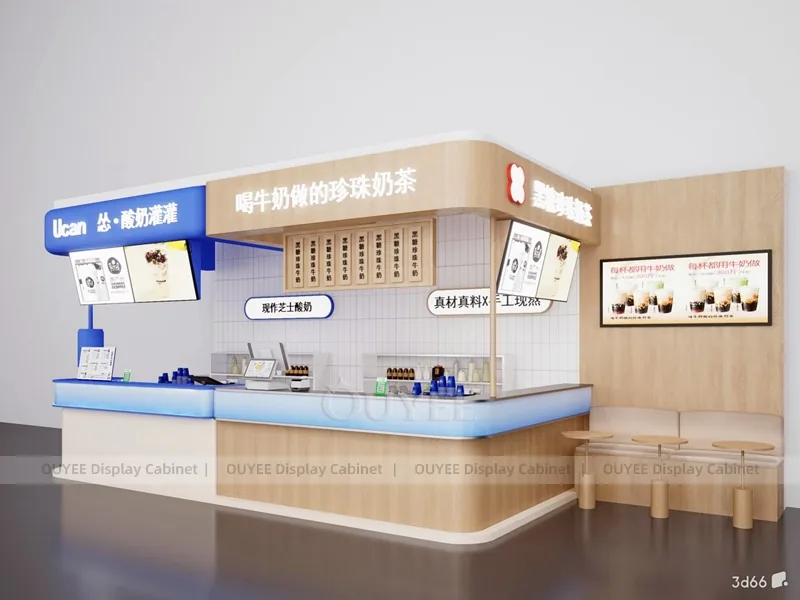 OUYEE can customize this model with custom color retail finishes and durable counter and storage modules. Store owners can adjust size, finish, layout, logo panel, counter height, storage structure, service opening, pickup area, cup storage, equipment clearance, menu areas, cup storage, topping display, lighting position, counter depth, and brand logo details to match the final shop drawing.