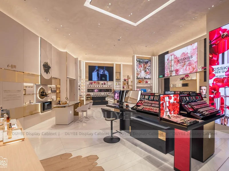 OUYEE can produce this model with premium laminate finishes, metallic trim details, tempered glass sections, and warm LED lighting. Dimensions, finish colors, shelf depths, light boxes, tester trays, logo panels, storage modules, and counter details can be adjusted to match the store plan and brand identity. Related inspiration is available across display shelves, display cases, wall display, and our store fixture manufacturing service.