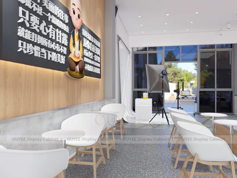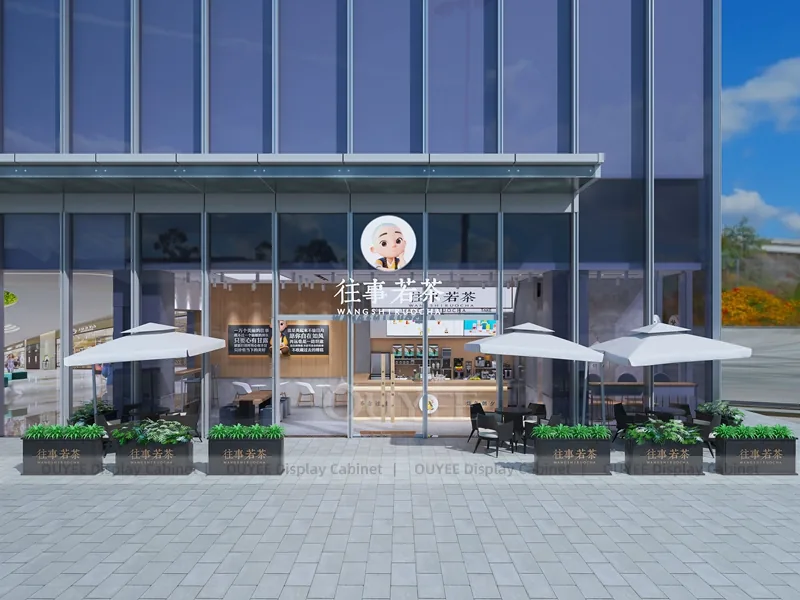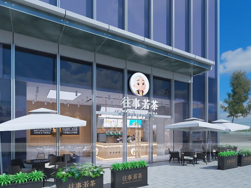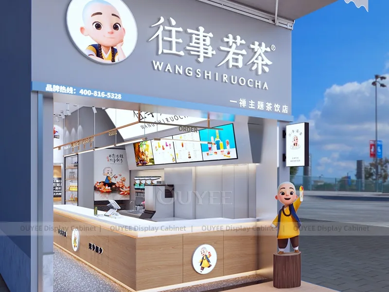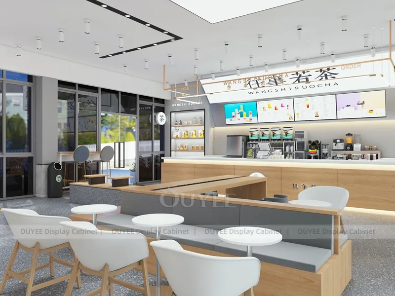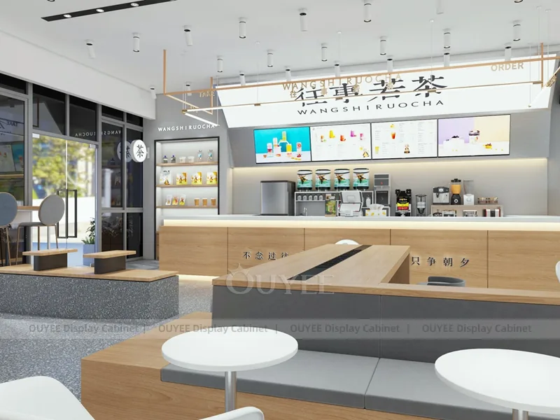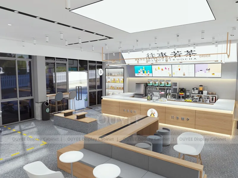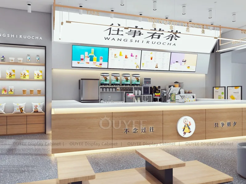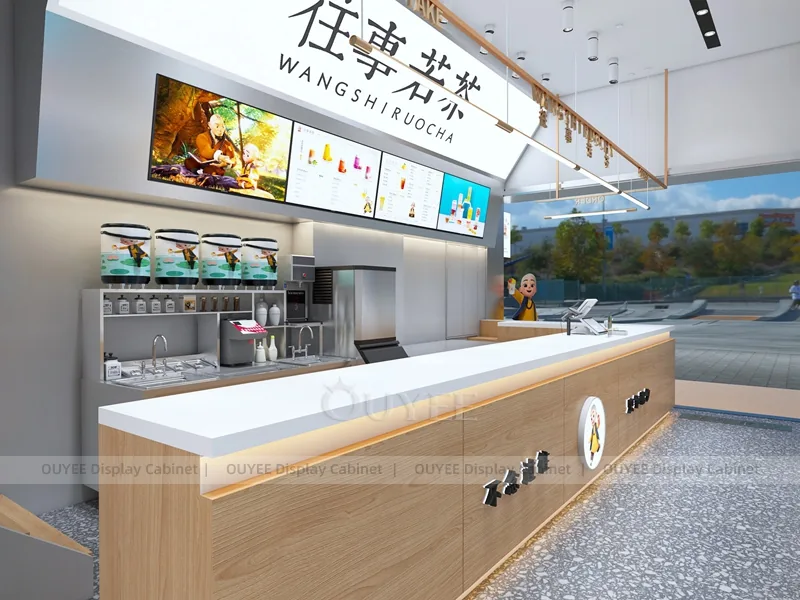 OUYEE can customize this model with durable counter and storage modules. Store owners can adjust size, finish, layout, logo panel, counter height, storage structure, service opening, pickup area, cup storage, equipment clearance, menu areas, cup storage, topping display, lighting position, counter depth, and brand logo details to match the final shop drawing.