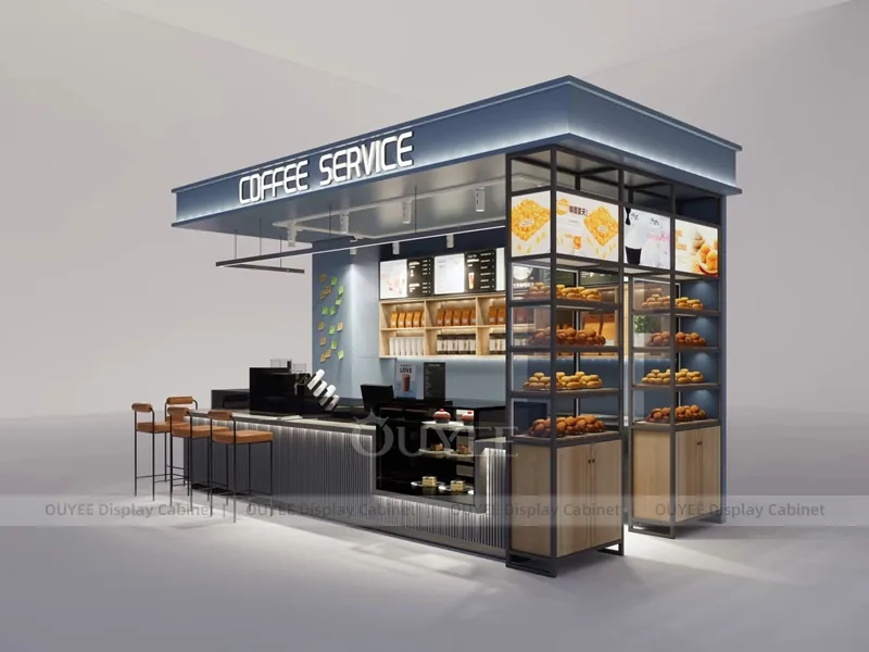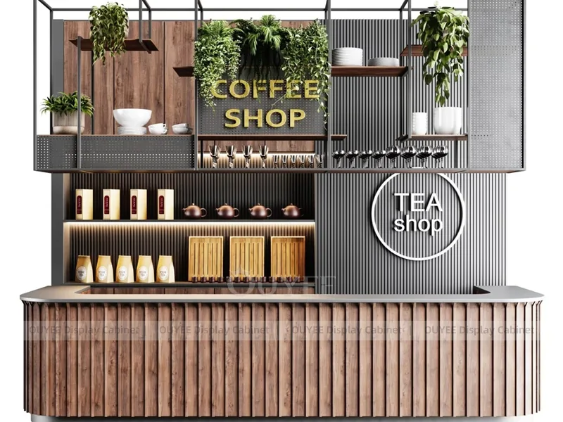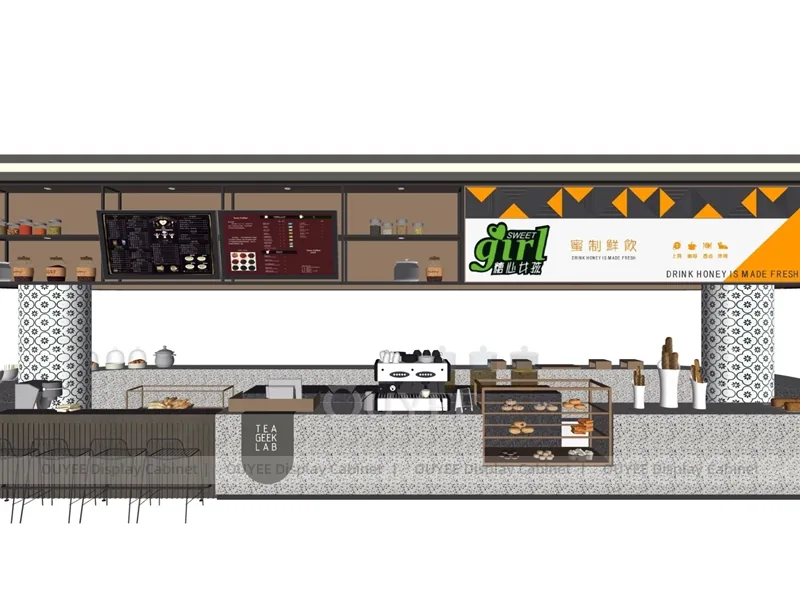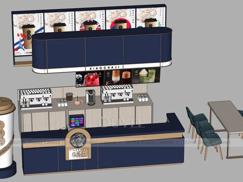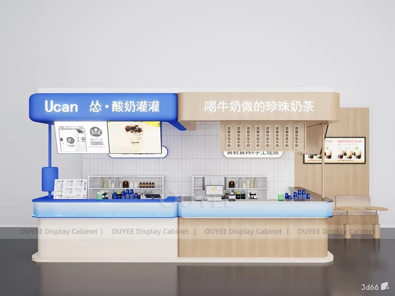 OUYEE can customize this model with durable counter and storage modules. Store owners can adjust size, finish, layout, logo panel, counter height, storage structure, service opening, pickup area, cup storage, equipment clearance, menu areas, cup storage, topping display, lighting position, counter depth, and brand logo details to match the final shop drawing.