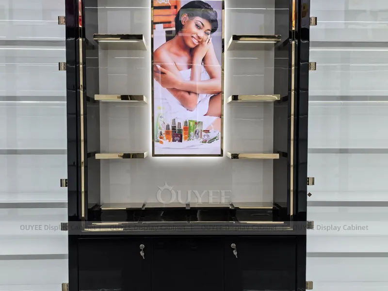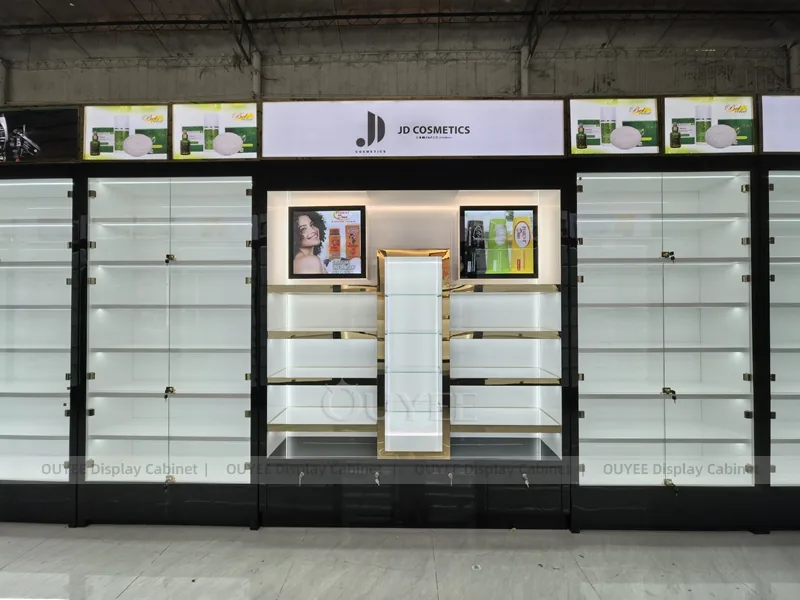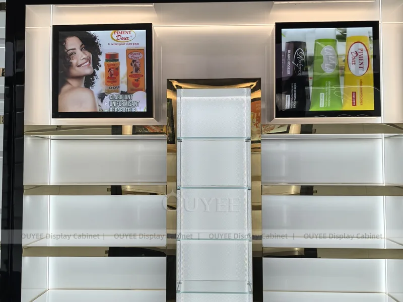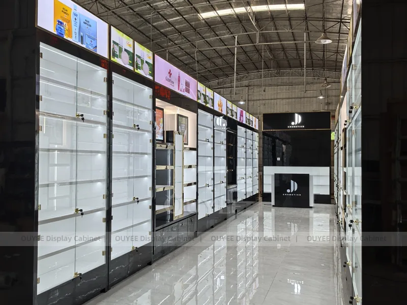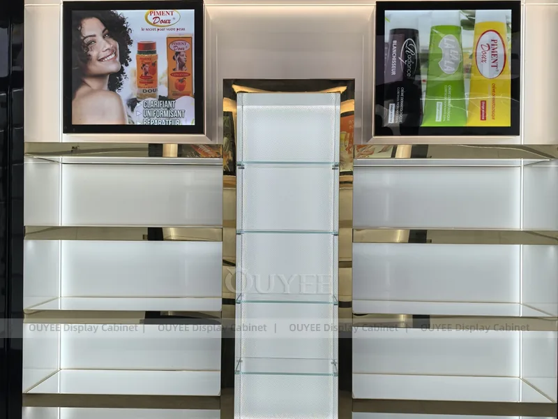 OUYEE can produce this model with commercial display panels, durable metal supports, tempered glass options, acrylic details, and integrated LED lighting. Dimensions, finish colors, shelf depths, light boxes, tester trays, logo panels, storage modules, and counter details can be adjusted to match the store plan and brand identity. Related inspiration is available across display shelves, wall display, display counter, and our store fixture manufacturing service.