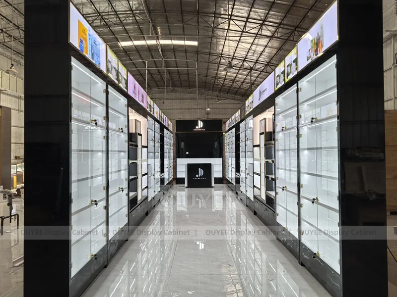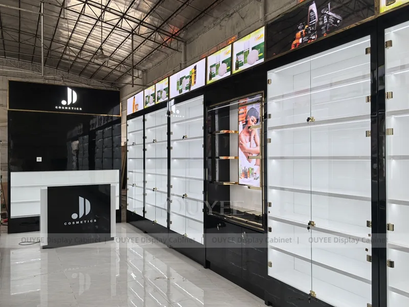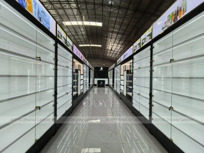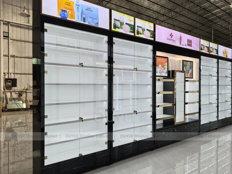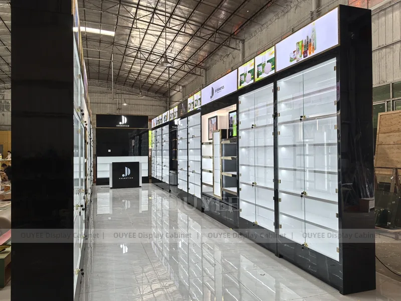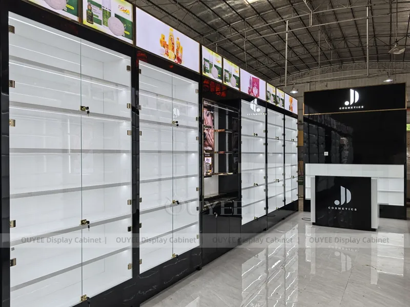 OUYEE can produce this model with commercial display panels, durable metal supports, tempered glass options, acrylic details, and integrated LED lighting. Dimensions, finish colors, shelf depths, light boxes, tester trays, logo panels, storage modules, and counter details can be adjusted to match the store plan and brand identity. Related inspiration is available across display shelves, wall display, display counter, and our store fixture manufacturing service.