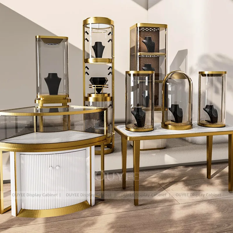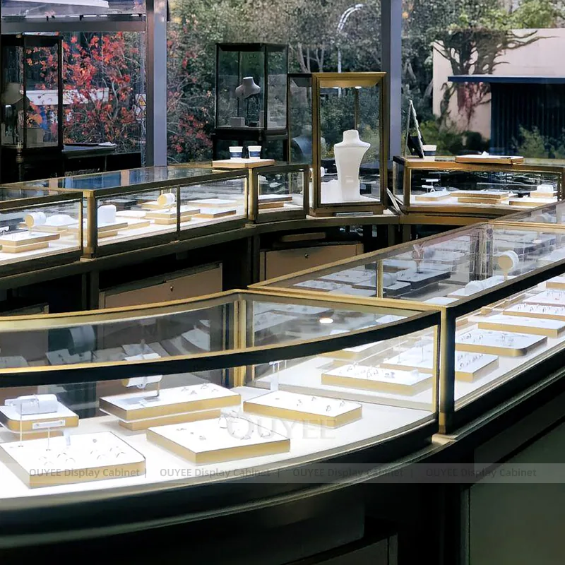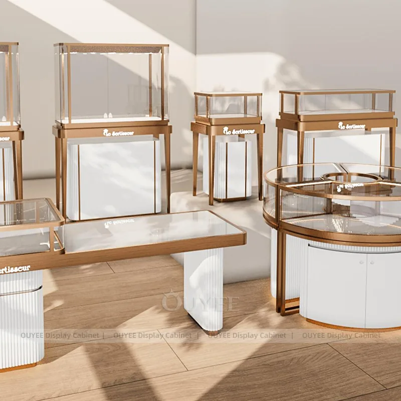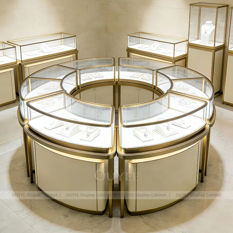 OUYEE can produce this model with tempered glass, lacquered display panels, and custom jewelry fixture joinery. We can adjust dimensions, counter heights, storage details, showcase proportions, branding areas, and warm beige finishes so the project fits the store concept, SKU mix, and floor plan. Related inspiration is available across jewelry shop displays, display cases and our store fixture manufacturing service.