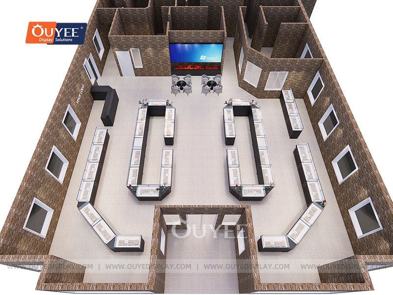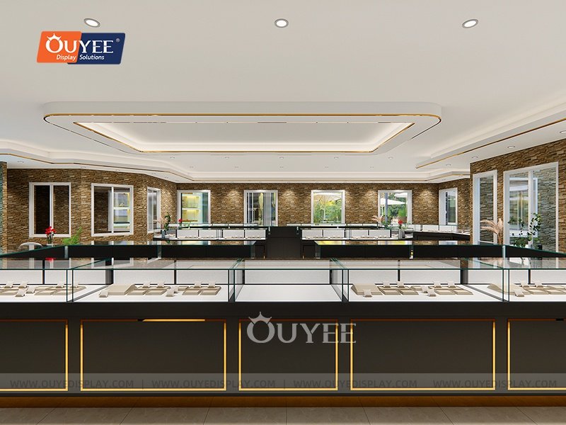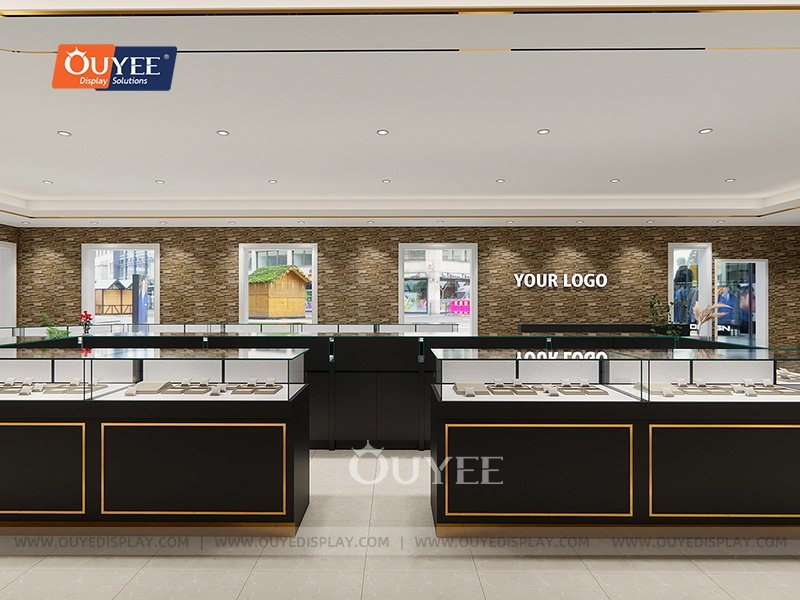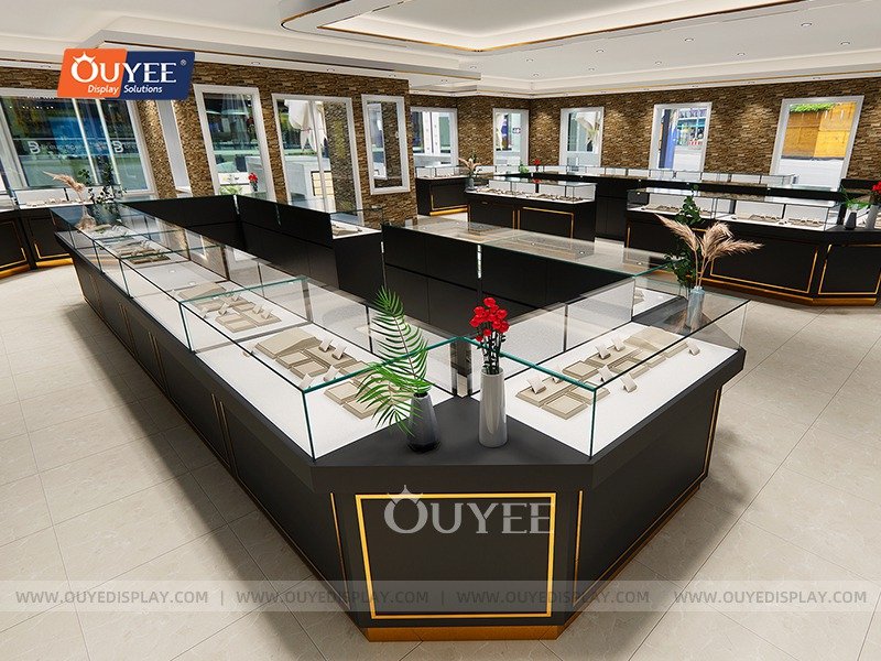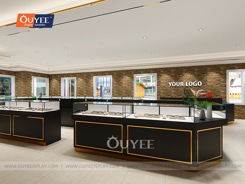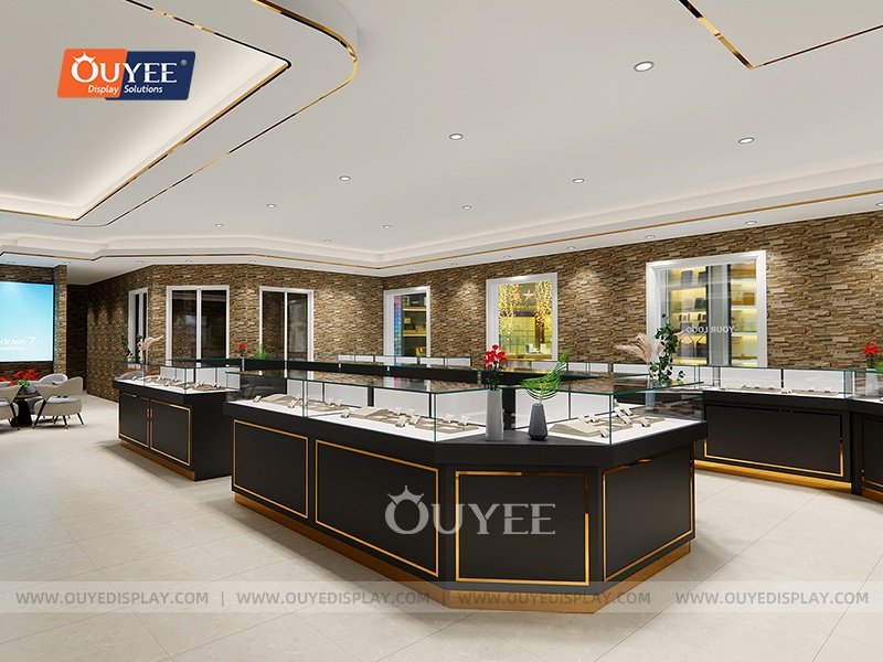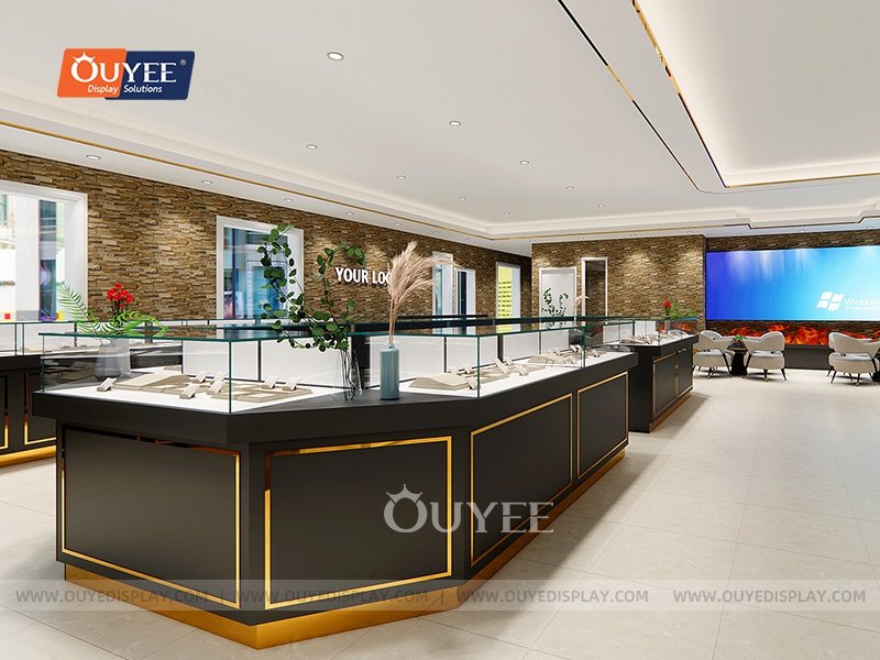 OUYEE’s jewelry display cases are the heart of a luxurious jewelry store interior, highlighting the brand’s exquisite design craftsmanship. The modern black and gold trim of these display cabinets adds a touch of sophistication, guiding customers through the store and accentuating the unique qualities of each piece of jewelry.