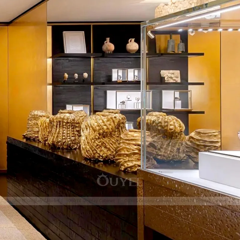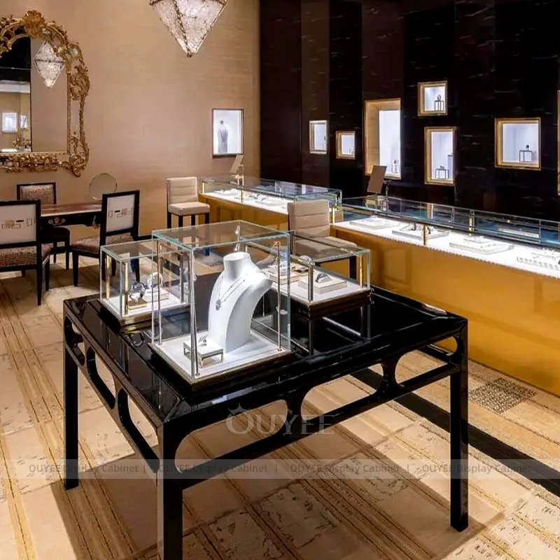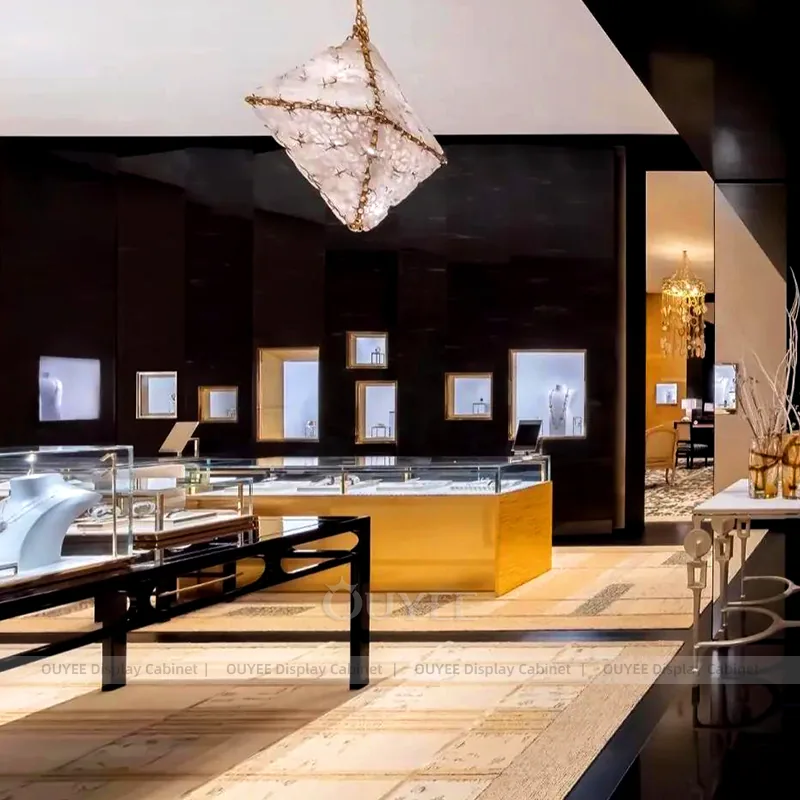 OUYEE can produce this model with tempered glass, lacquered display panels, integrated LED lighting, and custom jewelry fixture joinery. We can adjust dimensions, counter heights, storage details, showcase proportions, branding areas, and soft cream finishes so the project fits the store concept, SKU mix, and floor plan. Related inspiration is available across jewelry shop displays, display cases and our store fixture manufacturing service.
