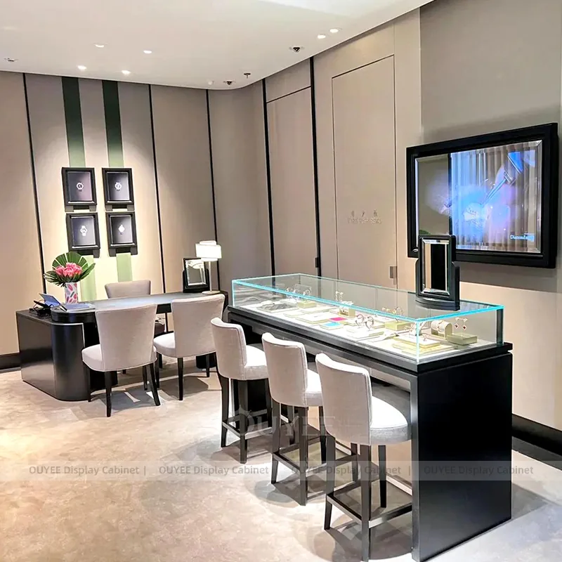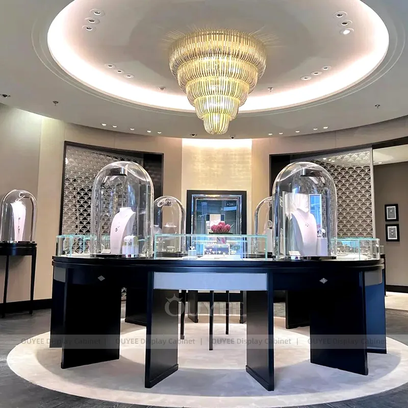 OUYEE can produce this model with tempered glass, lacquered display panels, and custom jewelry fixture joinery. We can adjust dimensions, counter heights, storage details, showcase proportions, branding areas, and soft cream finishes so the project fits the store concept, SKU mix, and floor plan. Related inspiration is available across jewelry shop displays, display cases and our store fixture manufacturing service.