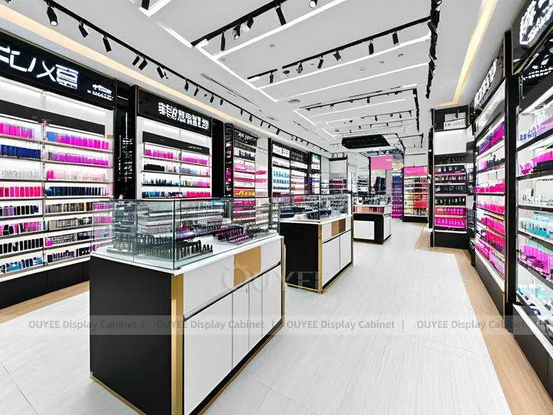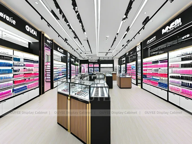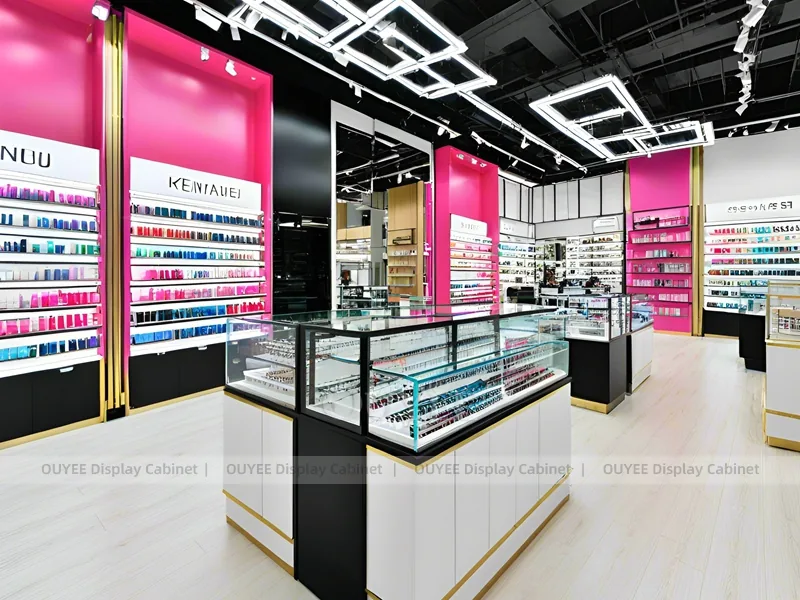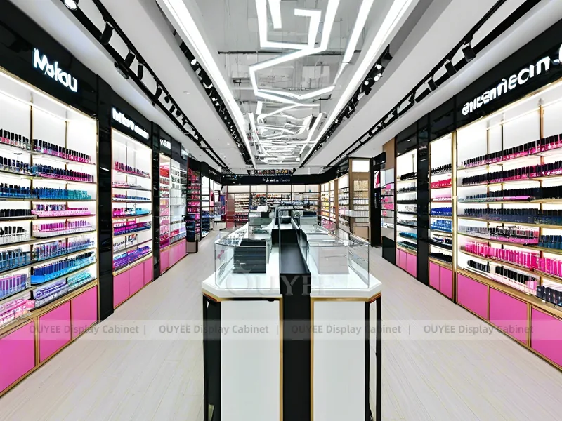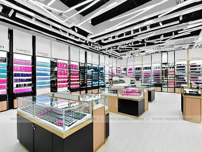 This configuration works well for cosmetic shops, makeup boutiques, beauty chain stores, department-store counters, and branded retail interiors. It is suitable for cosmetic store openings, beauty shop renovations, department-store counter upgrades, pop-up retail projects, and custom display fixture programs that need consistent production quality.