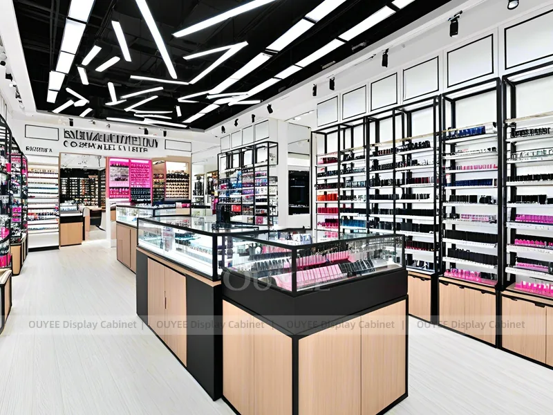 OUYEE can produce this model with tempered glass display sections, premium metal frames, LED lighting, and commercial-grade display panels. Dimensions, finish colors, shelf depths, light boxes, tester trays, logo panels, storage modules, and counter details can be adjusted to match the store plan and brand identity. Related inspiration is available across display shelves, wall display, display counter, and our store fixture manufacturing service.