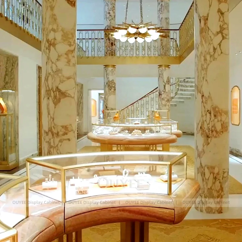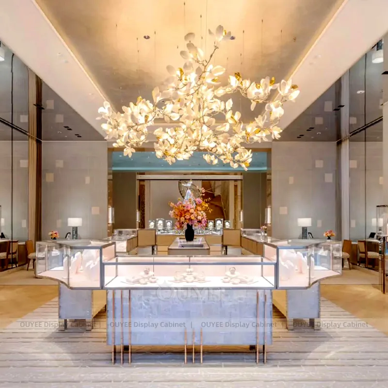 OUYEE can produce this model with tempered glass, marble-look accent panels, and integrated LED lighting. We can adjust dimensions, counter heights, storage details, showcase proportions, branding areas, and marble-accent detailing so the project fits the store concept, SKU mix, and floor plan. Related inspiration is available across jewelry shop displays, display cabinet and our store fixture manufacturing service.