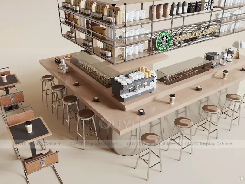 This design uses service-counter layout that connects ordering, drink pickup, storage, and product display zones. It gives the store clear ordering, pickup, display, storage, and replenishment zones so staff can work smoothly during busy drink-service hours.