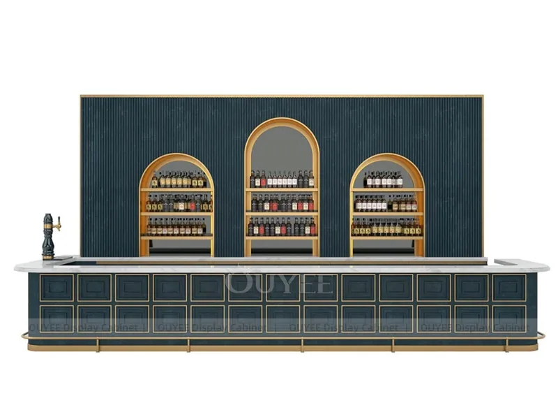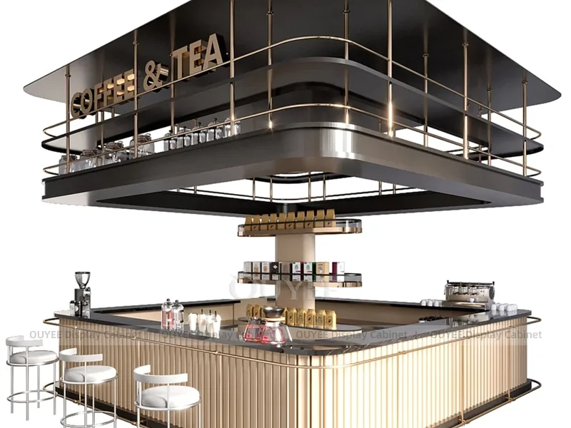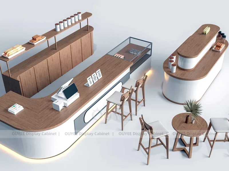 OUYEE can customize this model with durable counter and storage modules. Store owners can adjust size, finish, layout, logo panel, counter height, storage structure, service opening, pickup area, cup storage, equipment clearance, menu areas, cup storage, topping display, lighting position, counter depth, and brand logo details to match the final shop drawing.