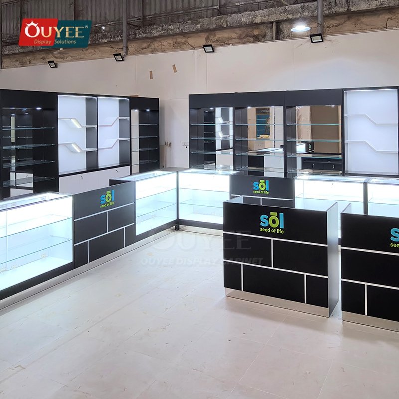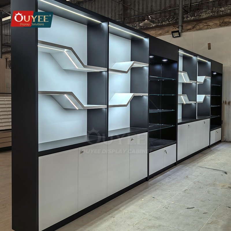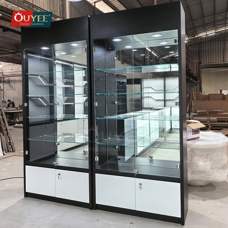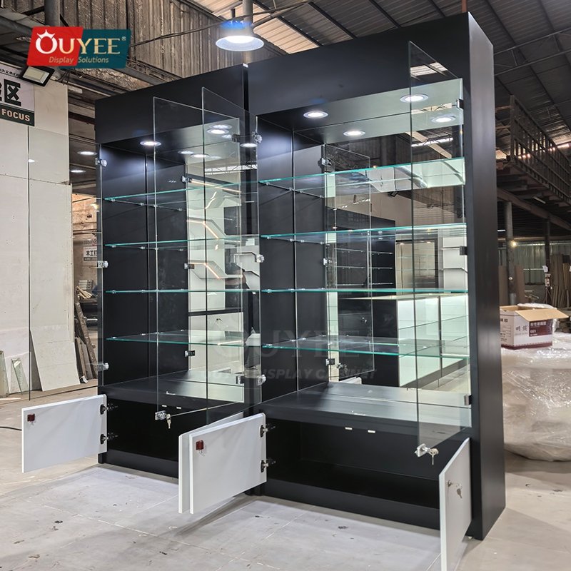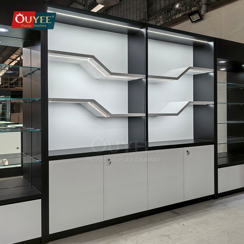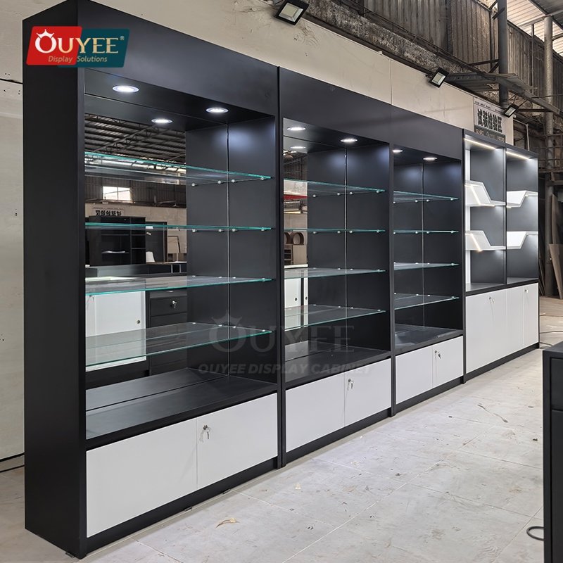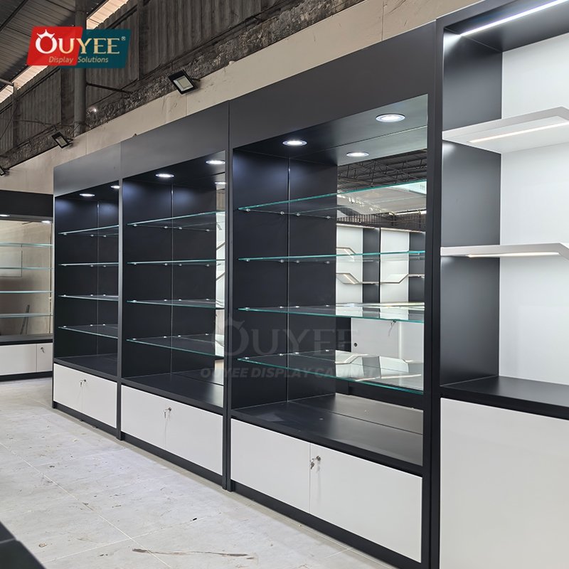Built with tempered glass, and metal framing, this custom display solution is made for long-term commercial use. OUYEE can adjust cabinet dimensions, shelf positions, lighting temperature, finish tones, storage modules, and logo details to match different retail concepts. If your project also needs related showcase ideas, you can browse our glass display cabinet and display cases pages for more references.