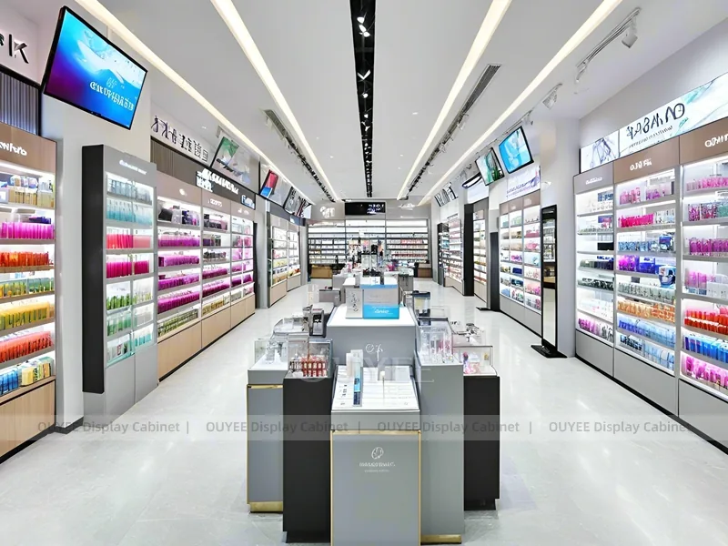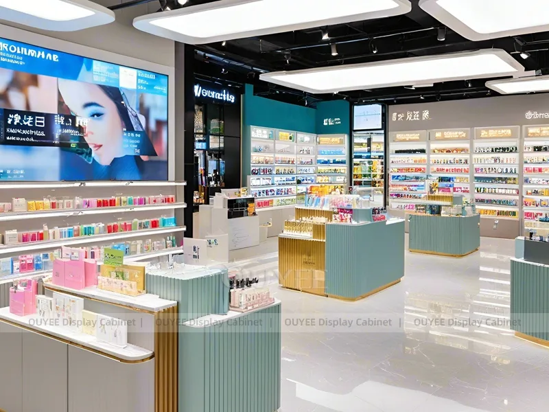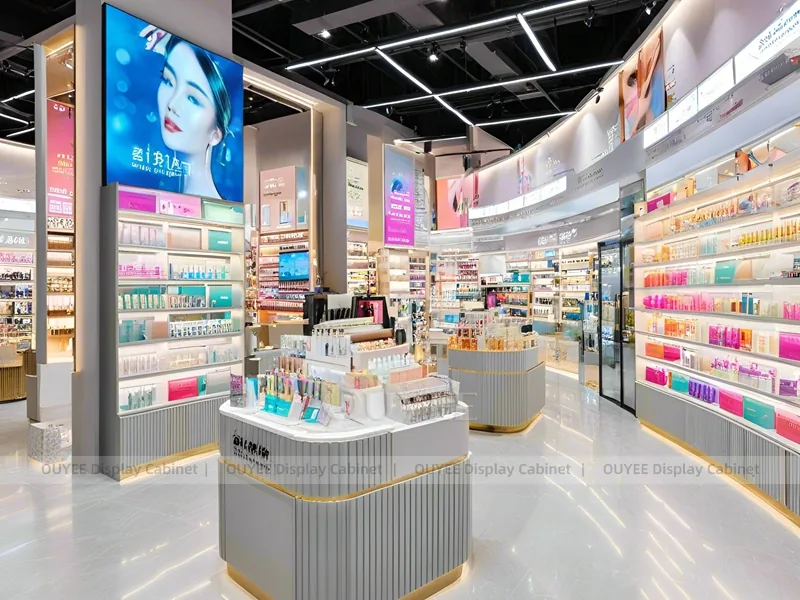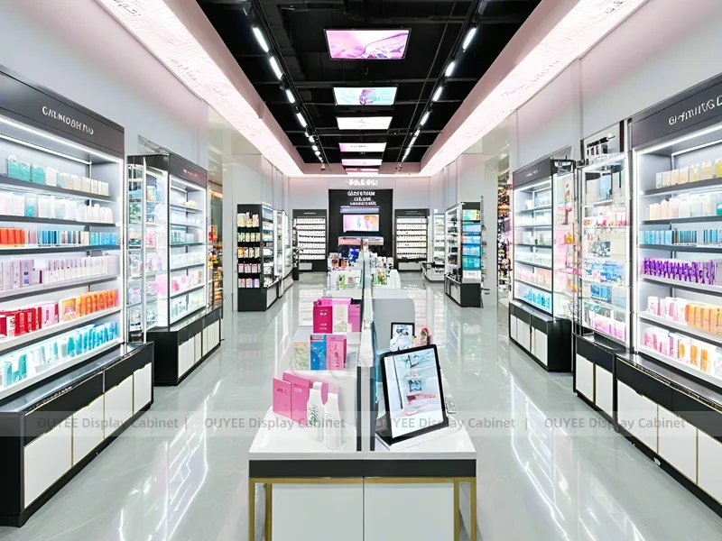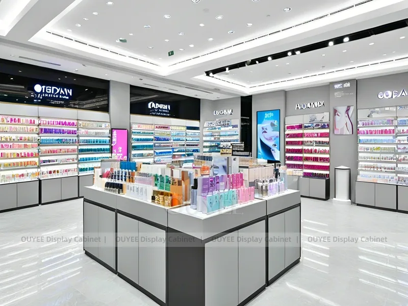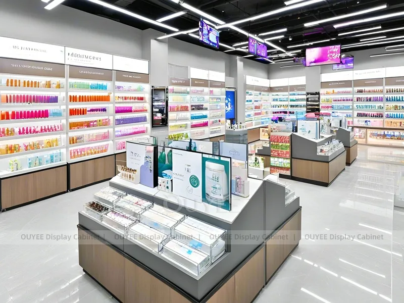 OUYEE can produce this model with custom color retail panels, durable shelving, metal supports, acrylic accents, and integrated LED lighting. Dimensions, finish colors, shelf depths, light boxes, tester trays, logo panels, storage modules, and counter details can be adjusted to match the store plan and brand identity. Related inspiration is available across display shelves, wall display, display counter, and our store fixture manufacturing service.