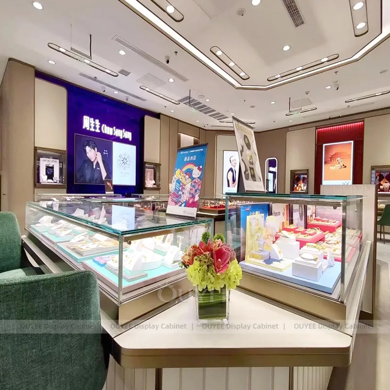 OUYEE can produce this model with tempered glass, lacquered display panels, and custom jewelry fixture joinery. We can adjust dimensions, counter heights, storage details, showcase proportions, branding areas, and warm beige finishes so the project fits the store concept, SKU mix, and floor plan. Related inspiration is available across jewelry shop displays, display cabinet and our store fixture manufacturing service.