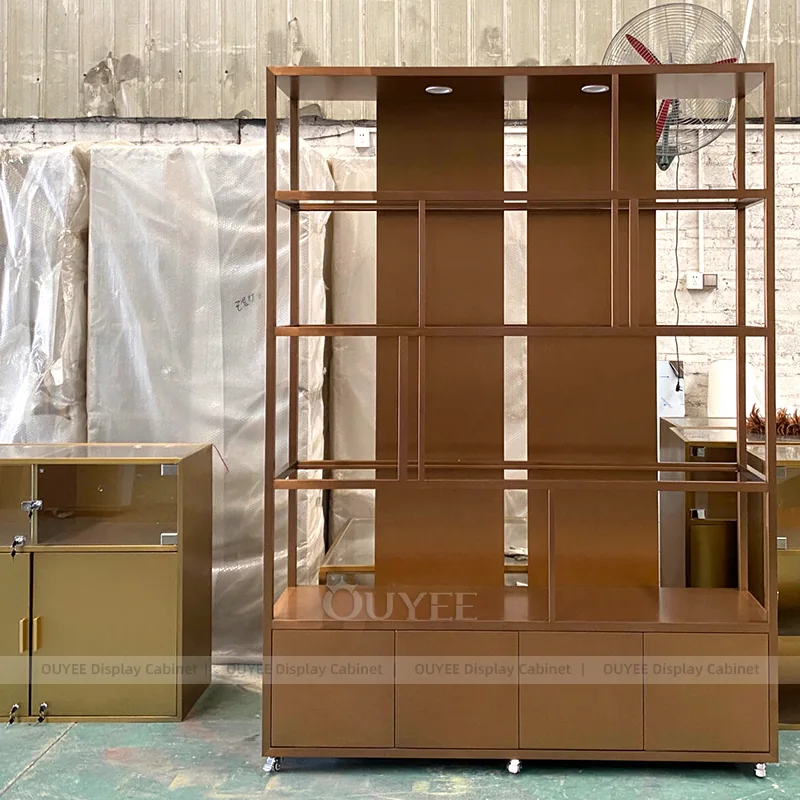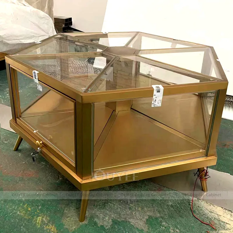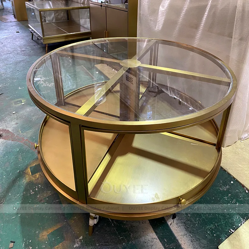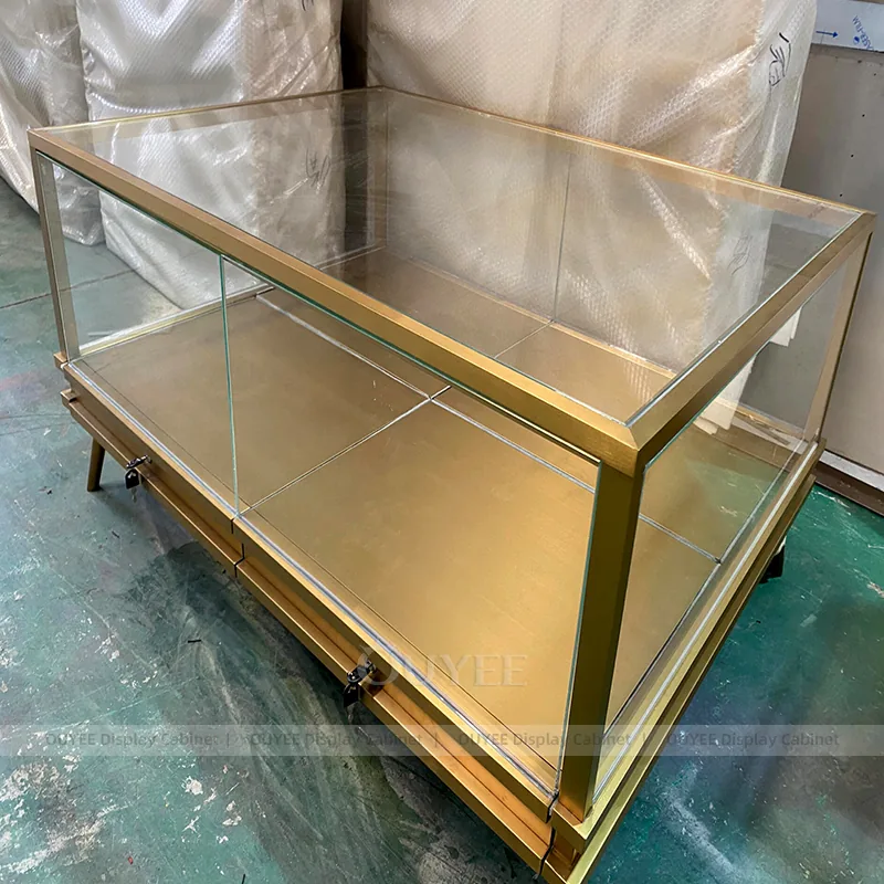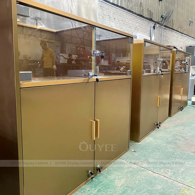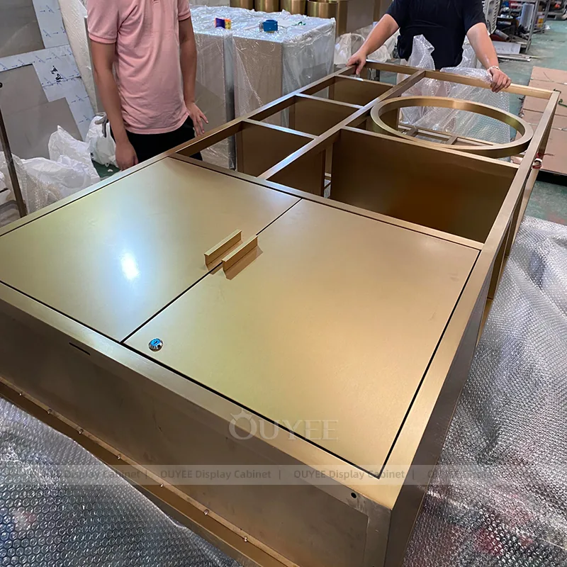 OUYEE can produce this model with tempered glass, champagne-gold metal trim, and custom jewelry fixture joinery. We can adjust dimensions, counter heights, storage details, showcase proportions, branding areas, and champagne-gold detailing so the project fits the store concept, SKU mix, and floor plan. Related inspiration is available across jewelry shop displays, display cases and our store fixture manufacturing service.