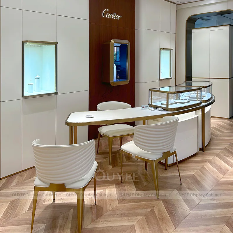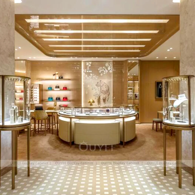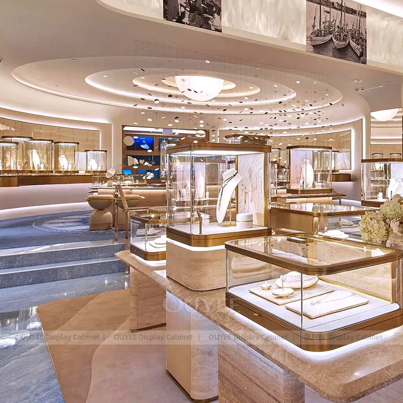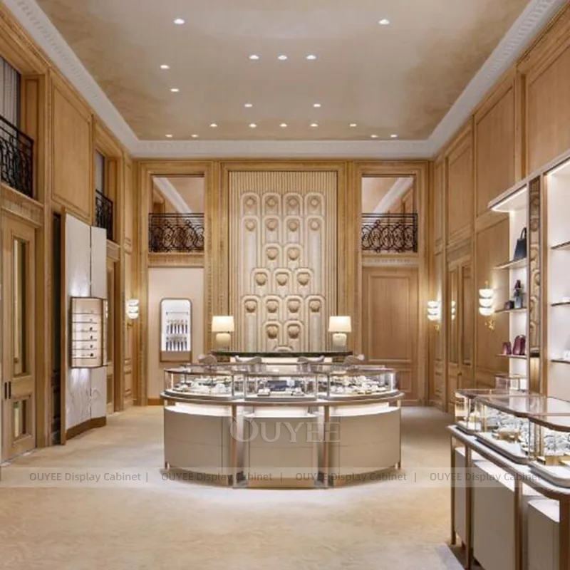 OUYEE can produce this model with tempered glass, lacquered display panels, and custom jewelry fixture joinery. We can adjust dimensions, counter heights, storage details, showcase proportions, branding areas, and soft cream finishes so the project fits the store concept, SKU mix, and floor plan. Related inspiration is available across jewelry shop displays, display cases and our store fixture manufacturing service.