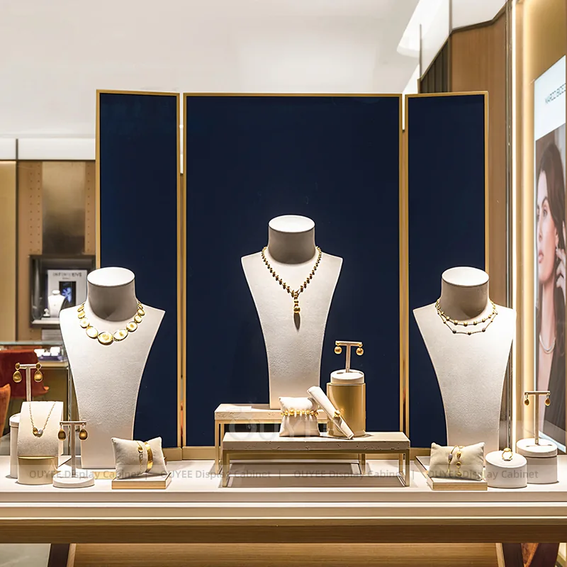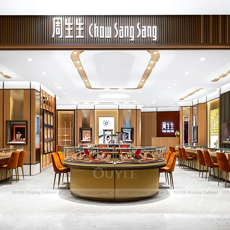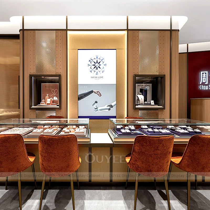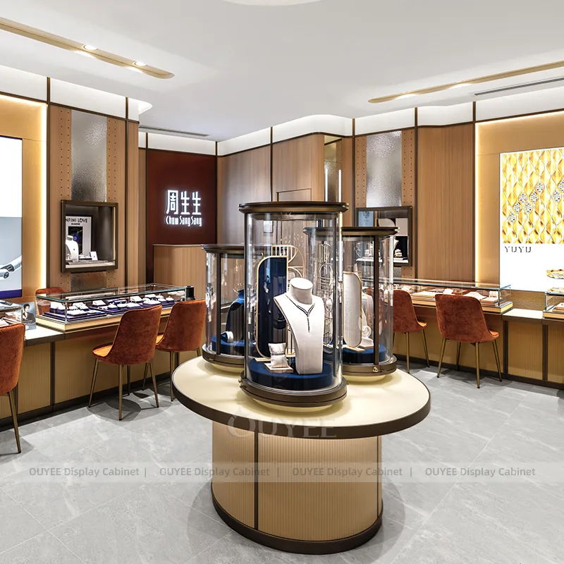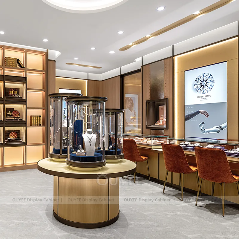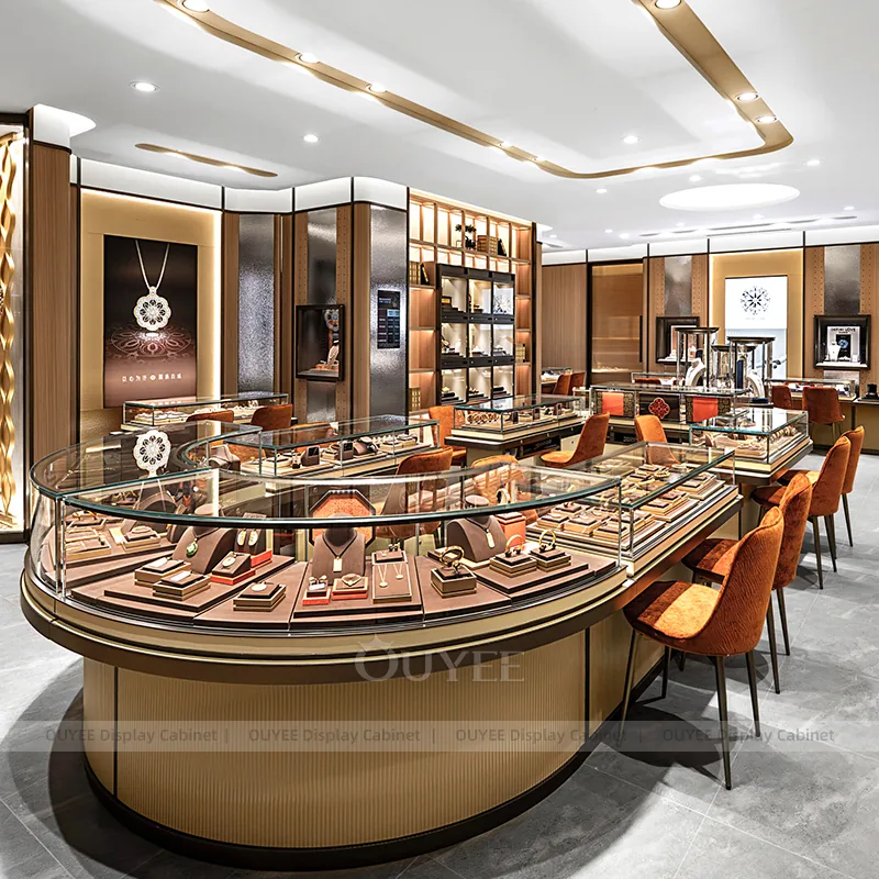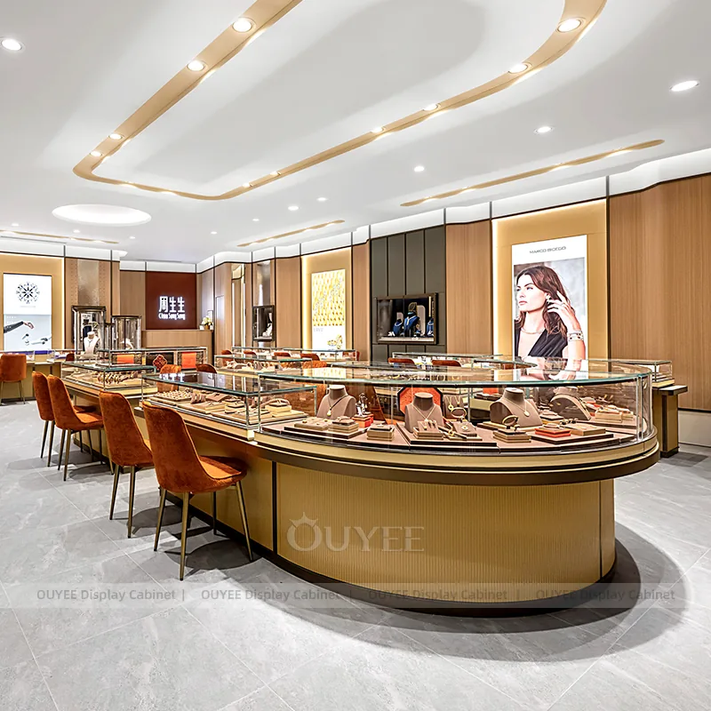 OUYEE can produce this model with tempered glass, lacquered display panels, and custom jewelry fixture joinery. We can adjust dimensions, counter heights, storage details, showcase proportions, branding areas, and soft cream finishes so the project fits the store concept, SKU mix, and floor plan. Related inspiration is available across jewelry shop displays, display cases and our store fixture manufacturing service.