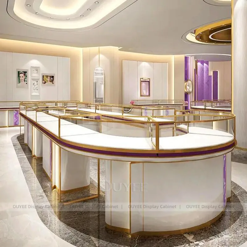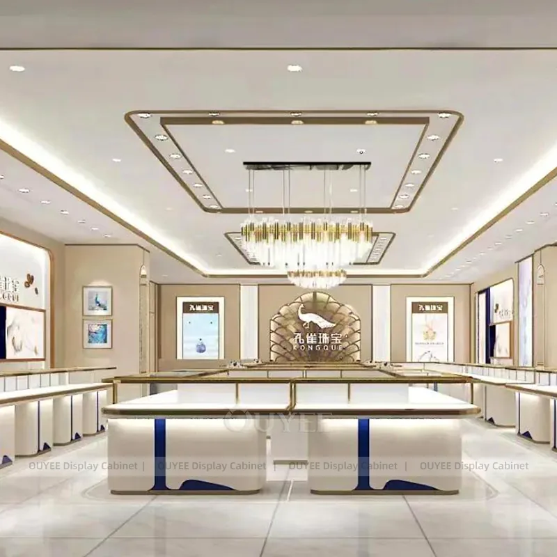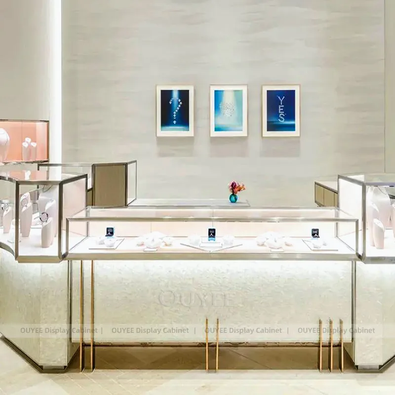 OUYEE can produce this model with tempered glass, lacquered display panels, and custom jewelry fixture joinery. We can adjust dimensions, counter heights, storage details, showcase proportions, branding areas, and soft cream finishes so the project fits the store concept, SKU mix, and floor plan. Related inspiration is available across jewelry shop displays, display cabinet and our store fixture manufacturing service.