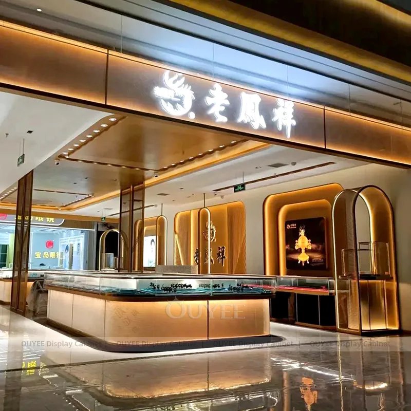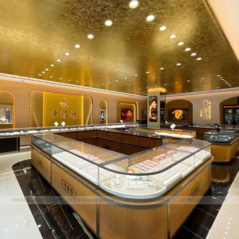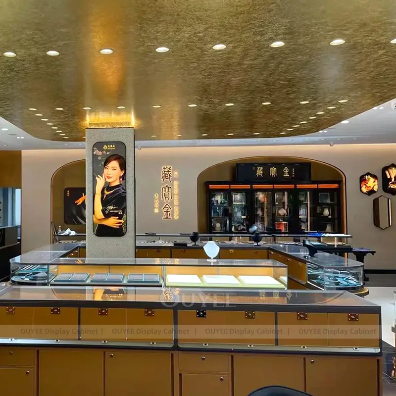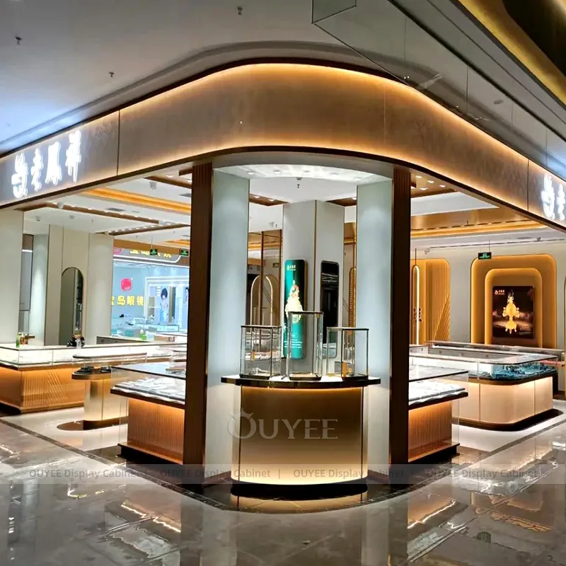 OUYEE can produce this model with tempered glass, marble-look accent panels, and custom jewelry fixture joinery. We can adjust dimensions, counter heights, storage details, showcase proportions, branding areas, and marble-accent detailing so the project fits the store concept, SKU mix, and floor plan. Related inspiration is available across jewelry shop displays, display cases and our store fixture manufacturing service.