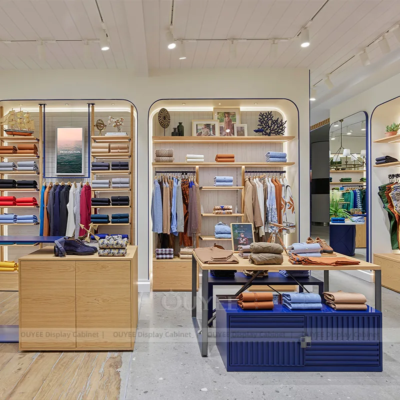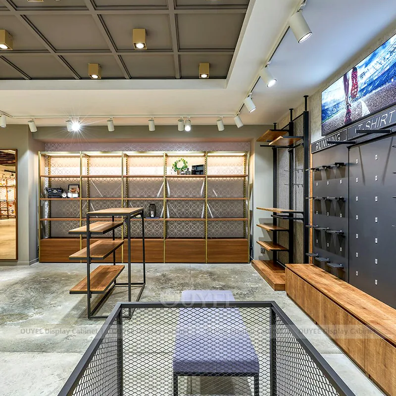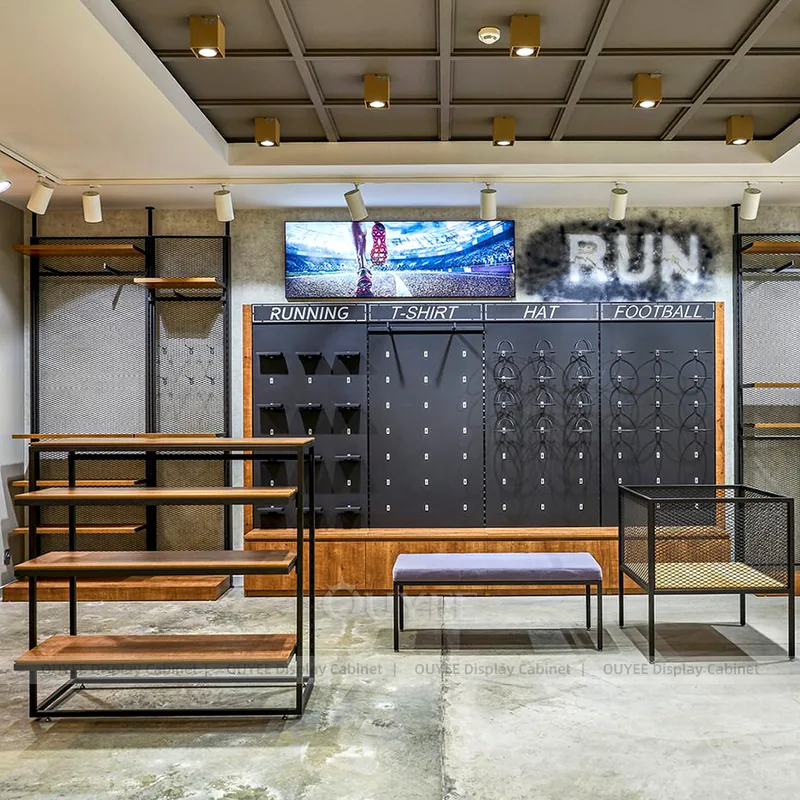OUYEE can produce this model with powder-coated metal framing and modular wall merchandising panels. Depending on the project, we can adjust dimensions, storage capacity, shelf depths, hanging components, branding graphics, and finish details so the system fits the real floor plan and product mix. Related inspiration is available across clothing racks, wall display and our store fixture manufacturing service.