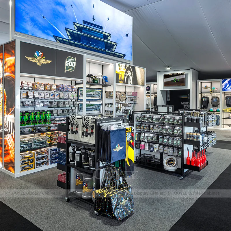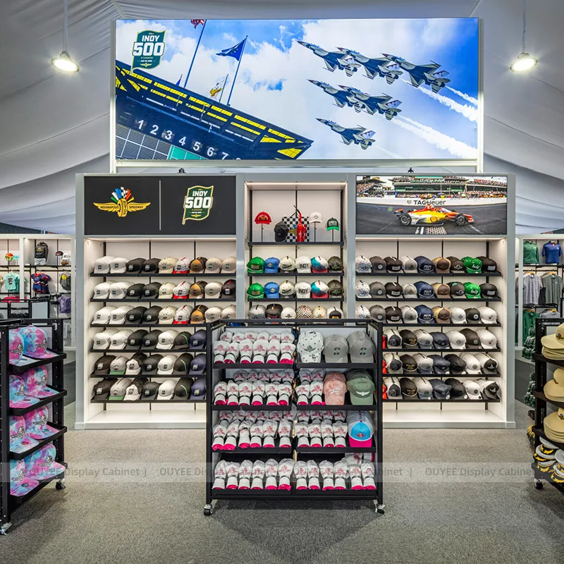 The Motorsports Cap Wall Shelving with Center Hat Display is designed for stadium team stores, university fan shops, sports merchandise retailers, and branded event retail that need a stronger balance between merchandising capacity, shopper flow, and coordinated visual presentation across wall, floor, and focal display zones.