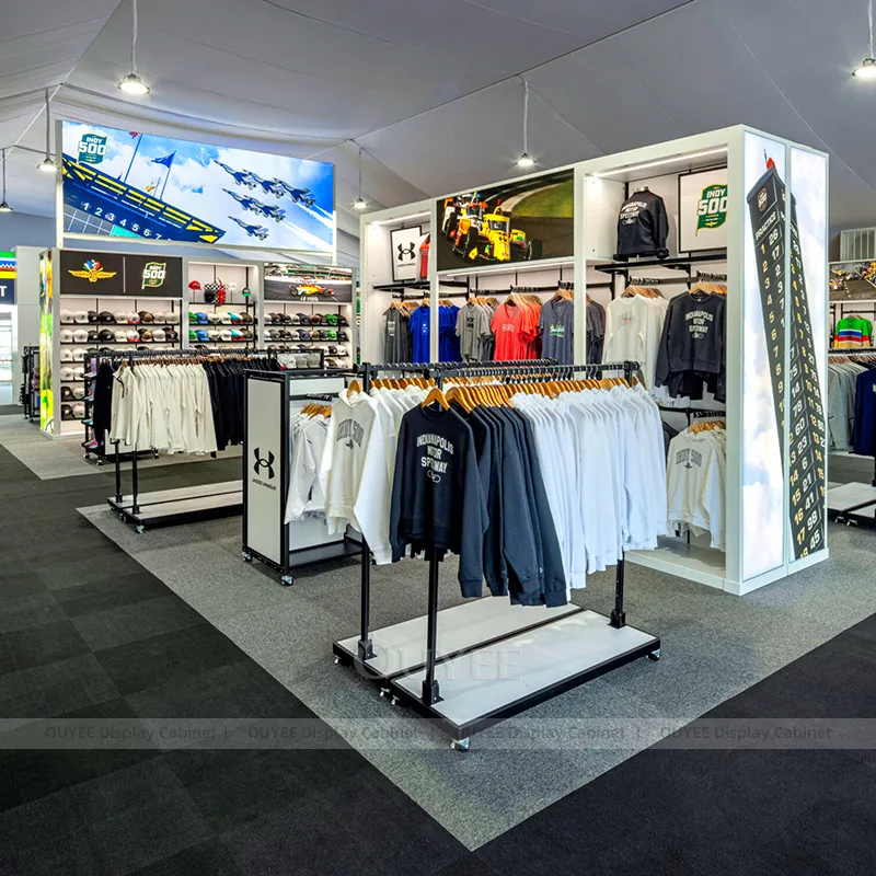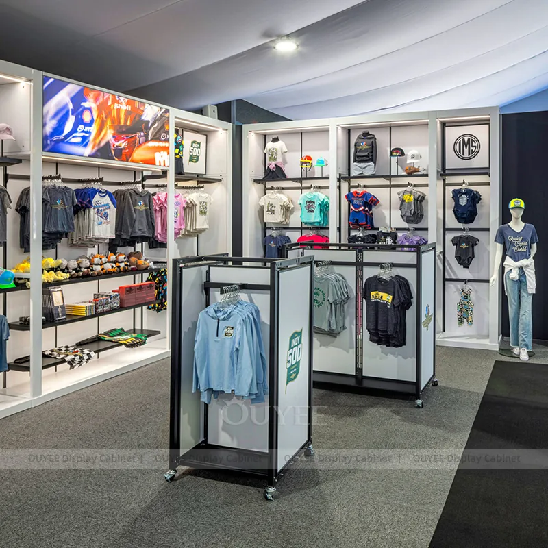 OUYEE can produce this model with powder-coated metal framing, modular wall merchandising panels, and integrated branding and lighting details. Depending on the project, we can adjust dimensions, storage capacity, shelf depths, hanging components, branding graphics, and finish details so the system fits the real floor plan and product mix. Related inspiration is available across clothing racks, wall display and our store fixture manufacturing service.