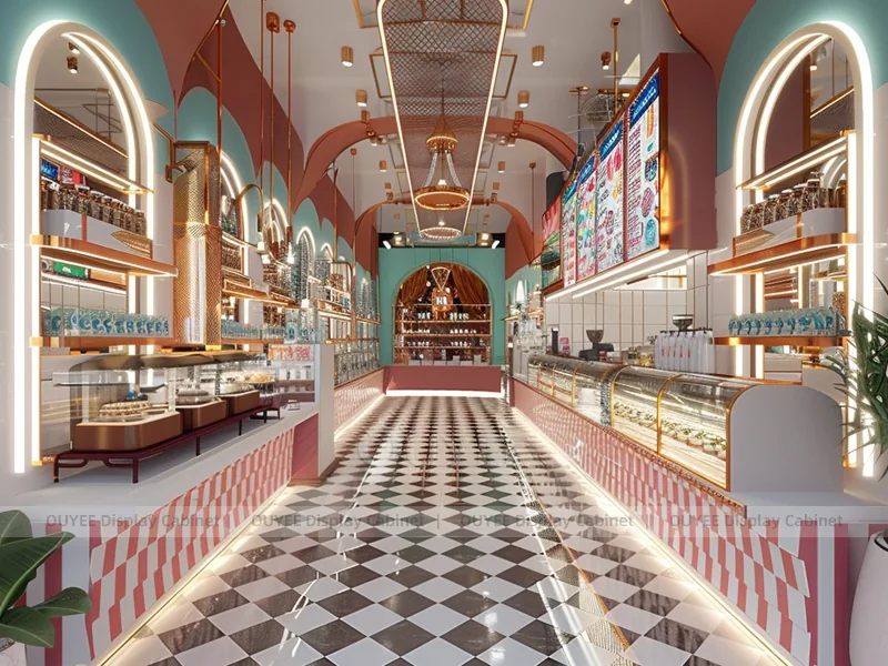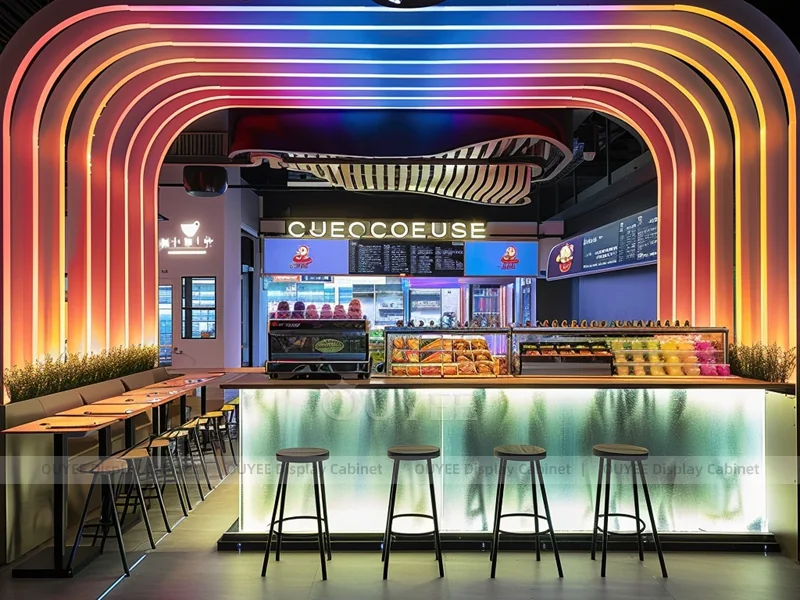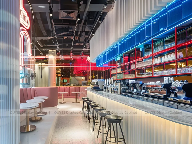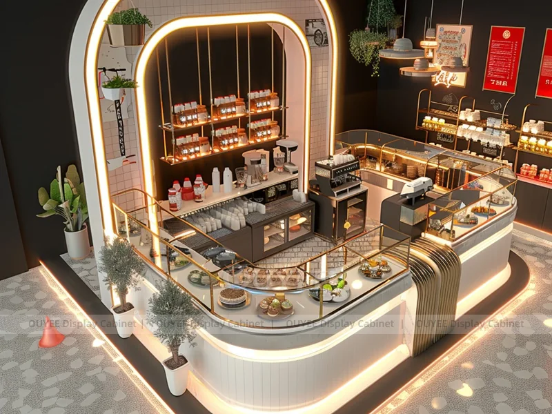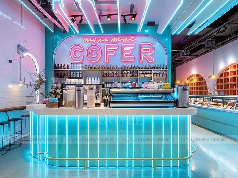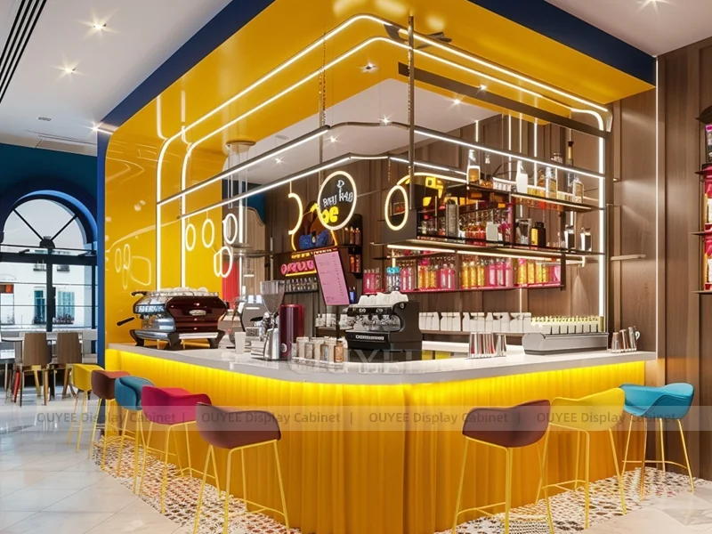 OUYEE supports coffee counter design, shop drawings, material selection, manufacturing, packing, and export delivery. We can customize the fixture according to your brand color, logo, store size, electrical planning, and installation requirements.