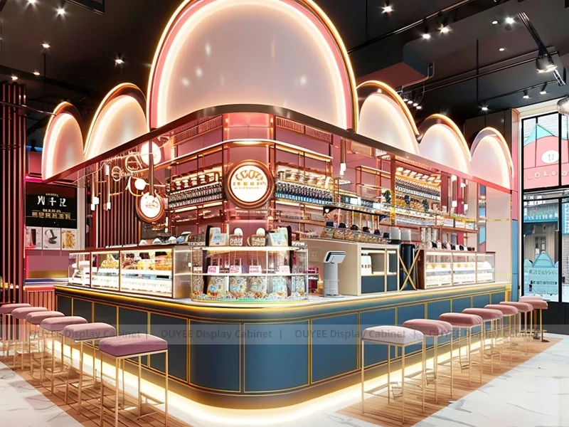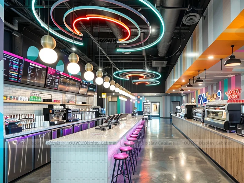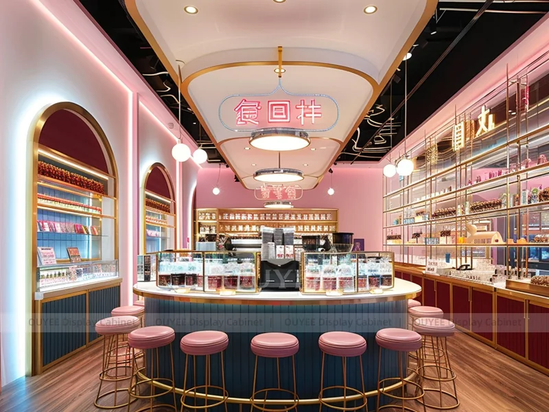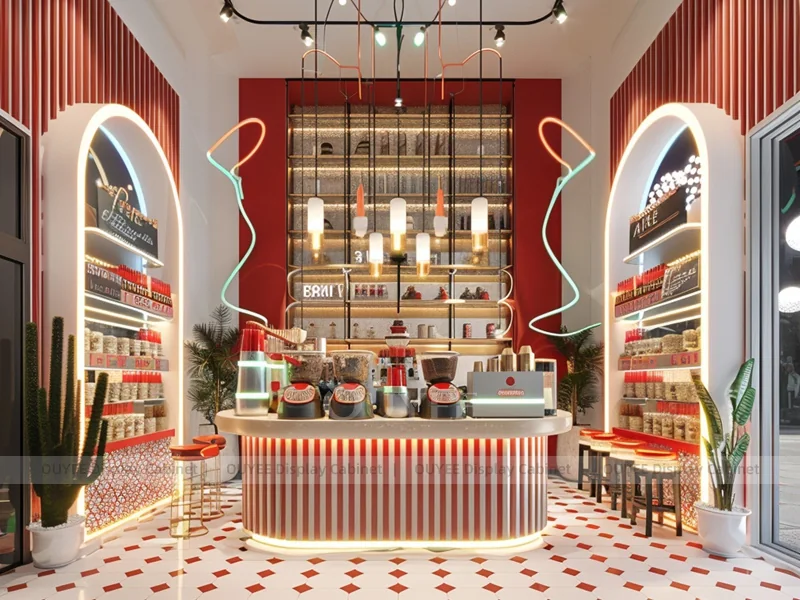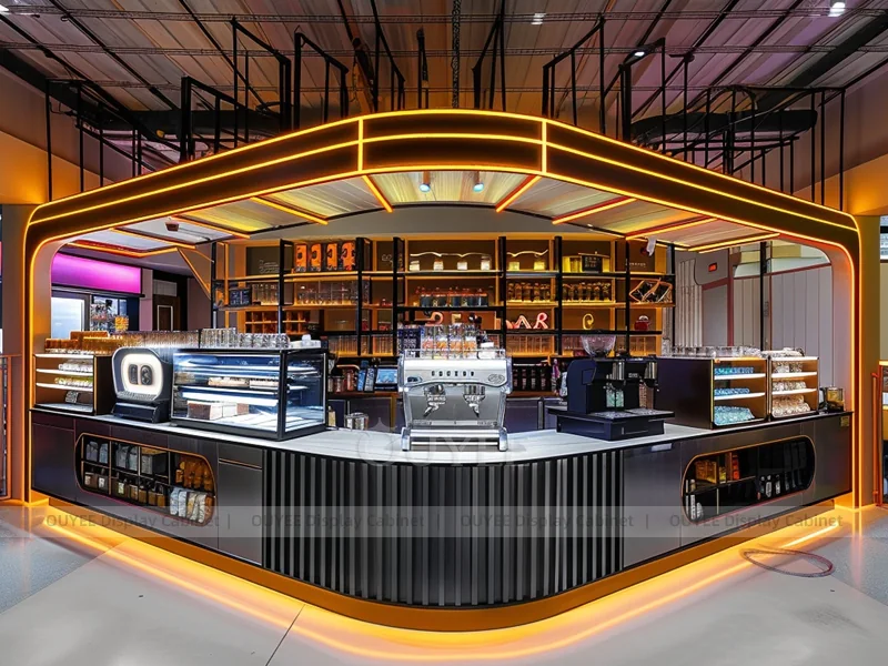 OUYEE supports coffee counter design, shop drawings, material selection, manufacturing, packing, and export delivery. We can customize the fixture according to your brand color, logo, store size, electrical planning, and installation requirements.