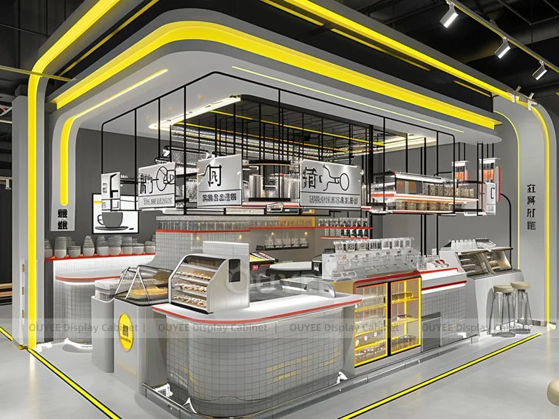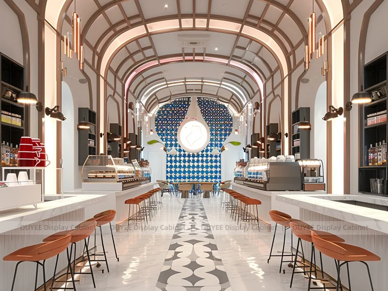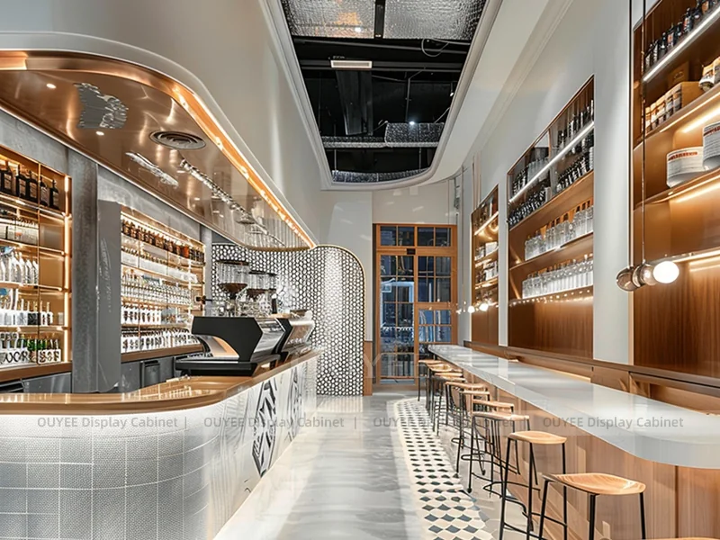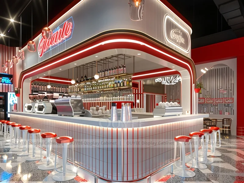 OUYEE supports coffee counter design, shop drawings, material selection, manufacturing, packing, and export delivery. We can customize the fixture according to your brand color, logo, store size, electrical planning, and installation requirements.