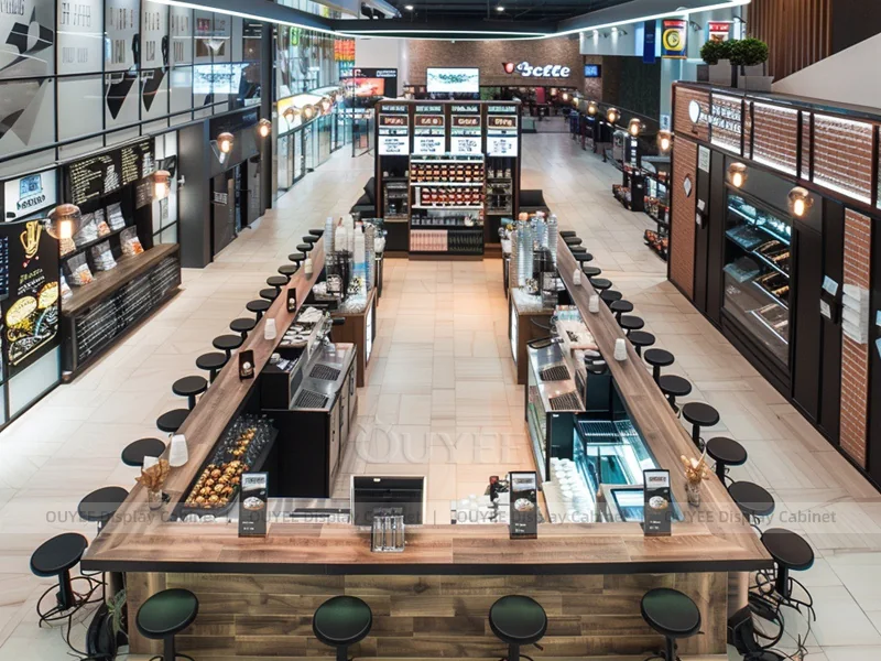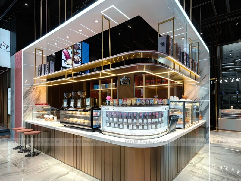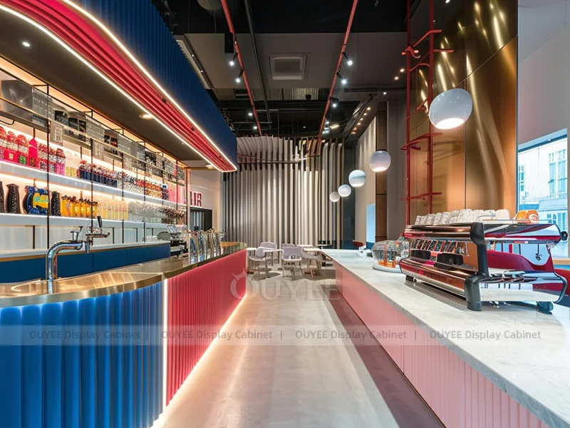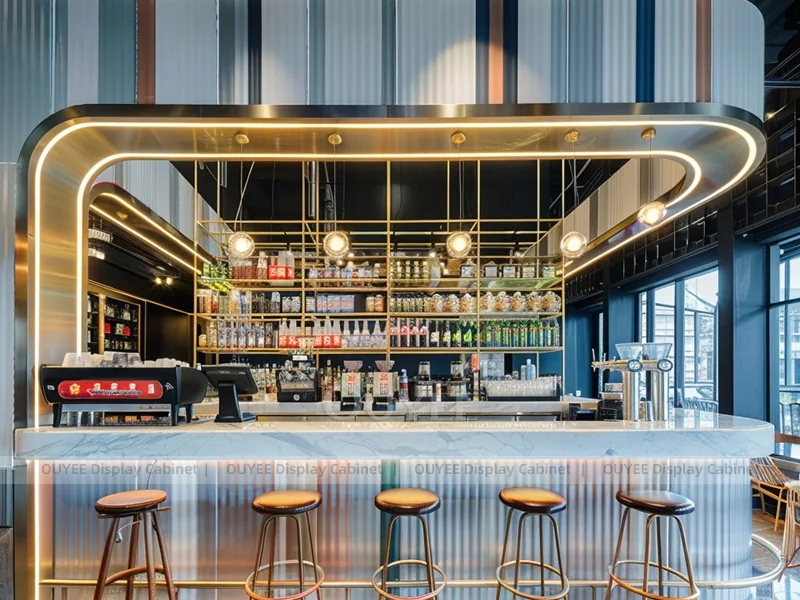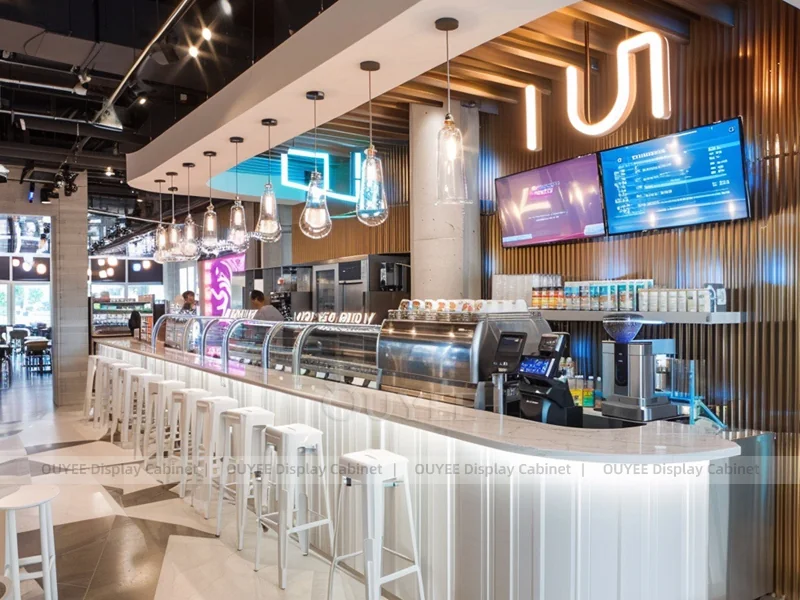 OUYEE supports coffee counter design, shop drawings, material selection, manufacturing, packing, and export delivery. We can customize the fixture according to your brand color, logo, store size, electrical planning, and installation requirements.