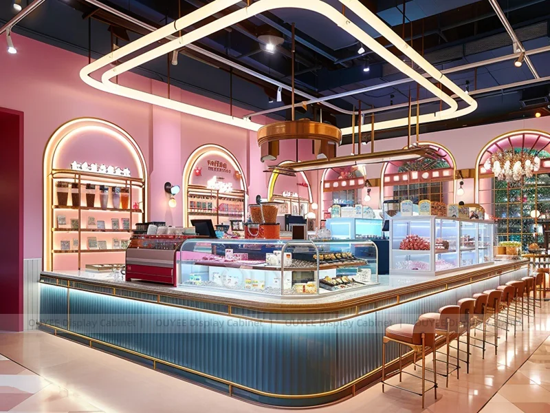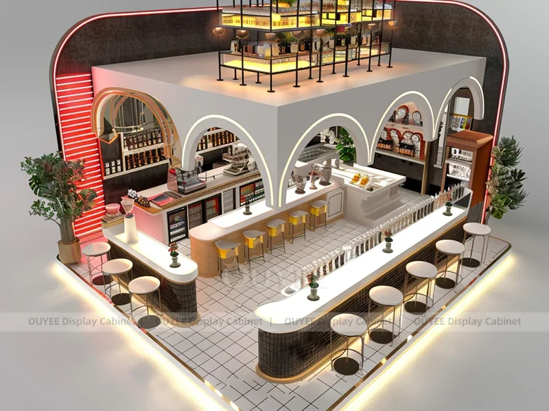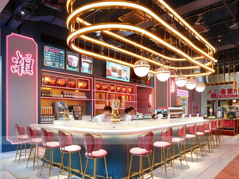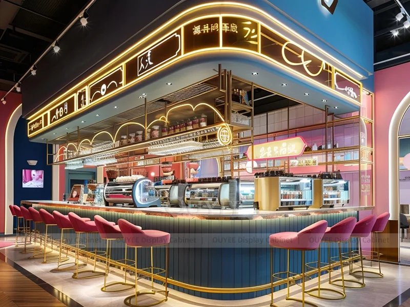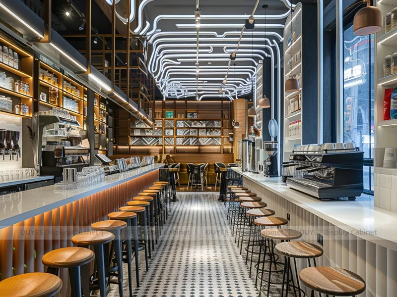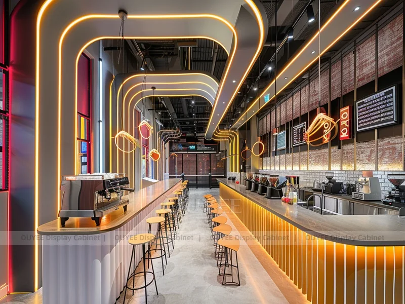 OUYEE supports coffee counter design, shop drawings, material selection, manufacturing, packing, and export delivery. We can customize the fixture according to your brand color, logo, store size, electrical planning, and installation requirements.