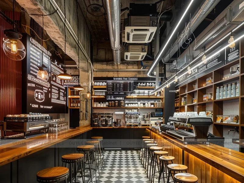 OUYEE supports coffee counter design, shop drawings, material selection, manufacturing, packing, and export delivery. We can customize the fixture according to your brand color, logo, store size, electrical planning, and installation requirements.