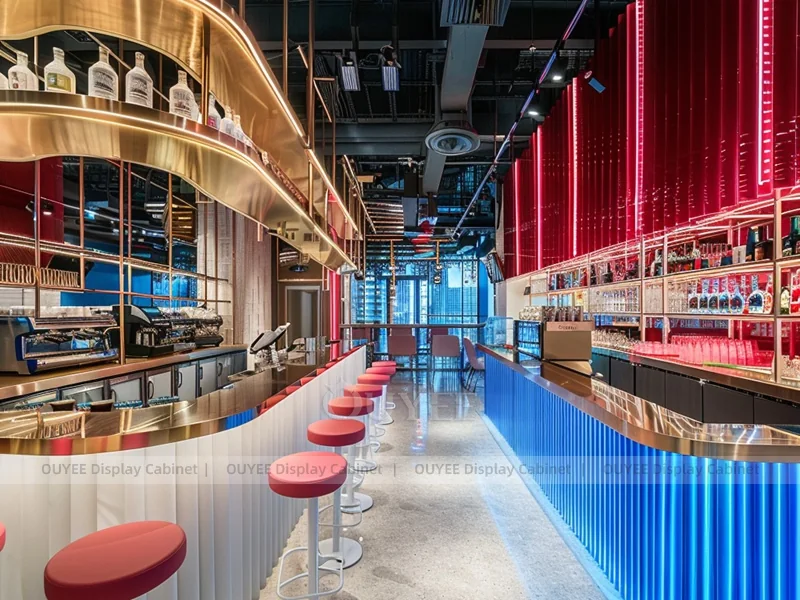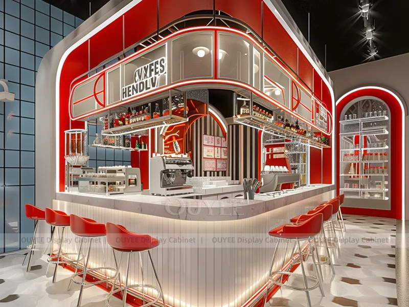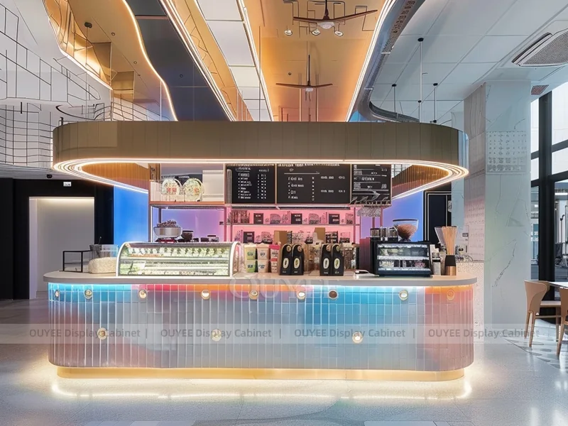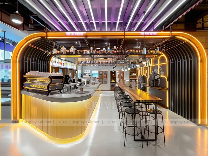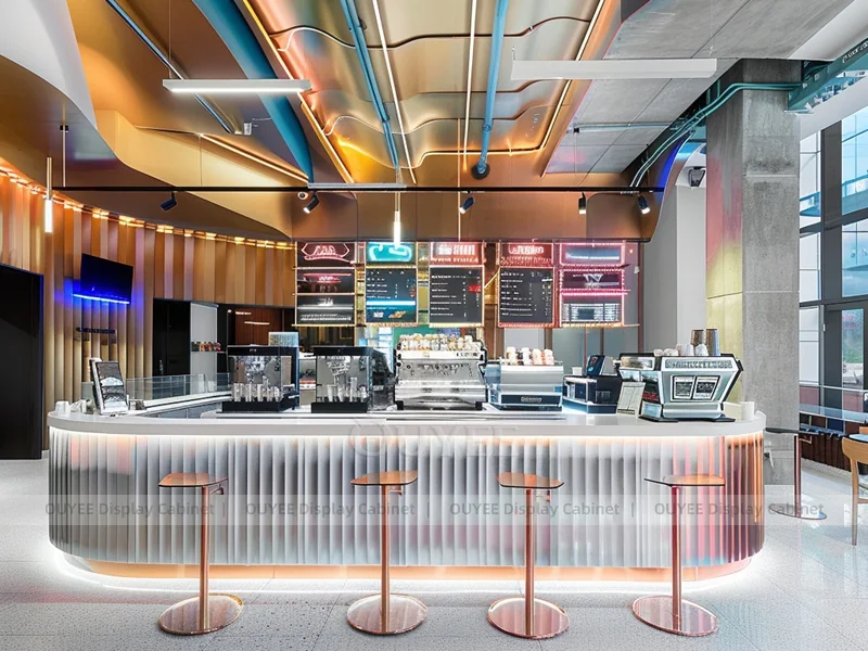 OUYEE supports coffee counter design, shop drawings, material selection, manufacturing, packing, and export delivery. We can customize the fixture according to your brand color, logo, store size, electrical planning, and installation requirements.