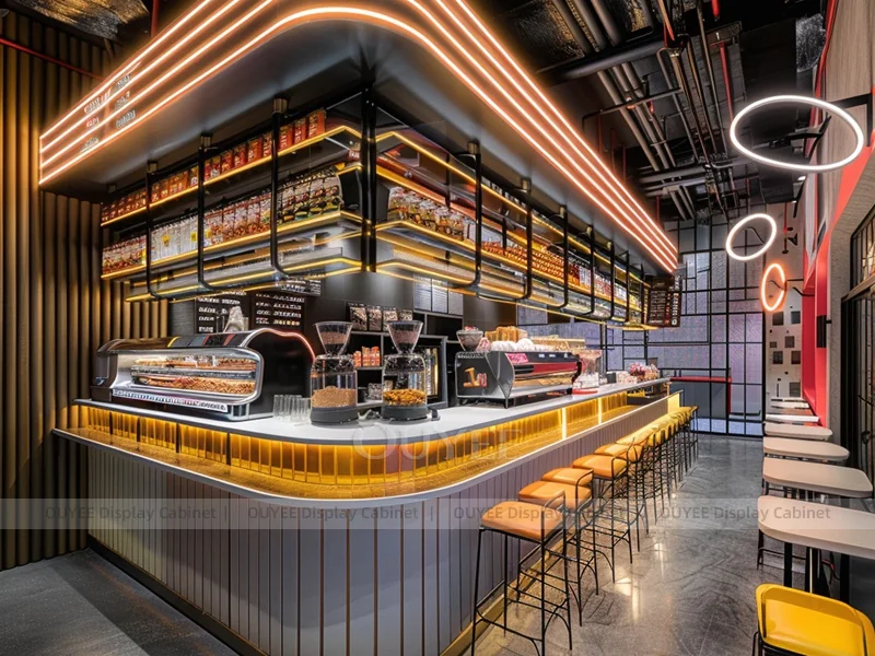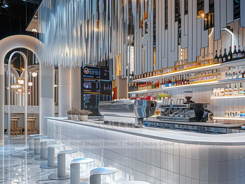 OUYEE supports coffee counter design, shop drawings, material selection, manufacturing, packing, and export delivery. We can customize the fixture according to your brand color, logo, store size, electrical planning, and installation requirements.