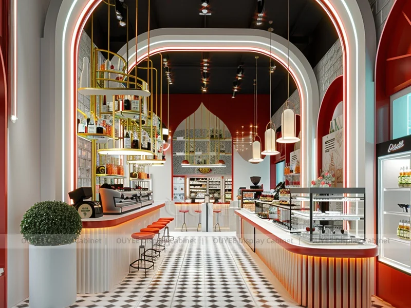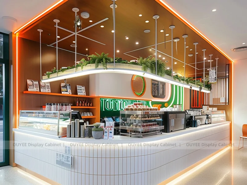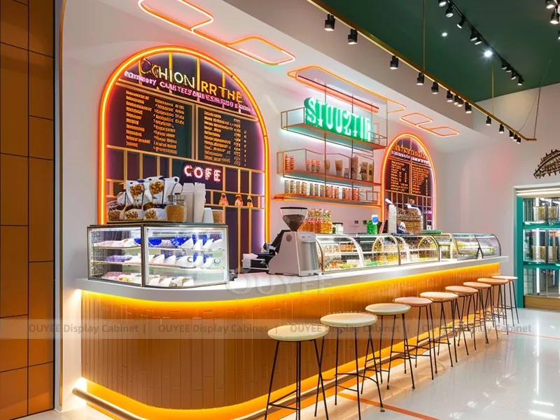 OUYEE supports coffee counter design, shop drawings, material selection, manufacturing, packing, and export delivery. We can customize the fixture according to your brand color, logo, store size, electrical planning, and installation requirements.