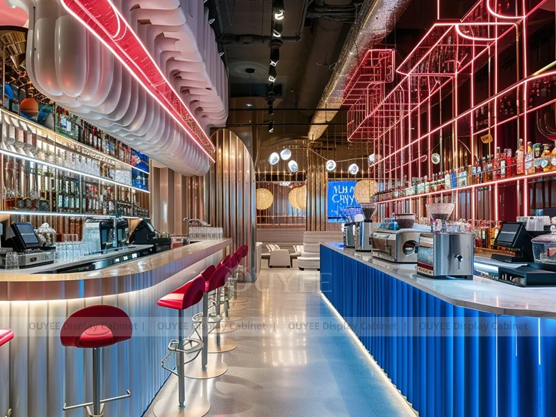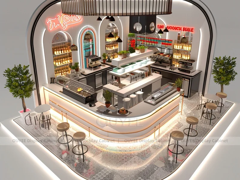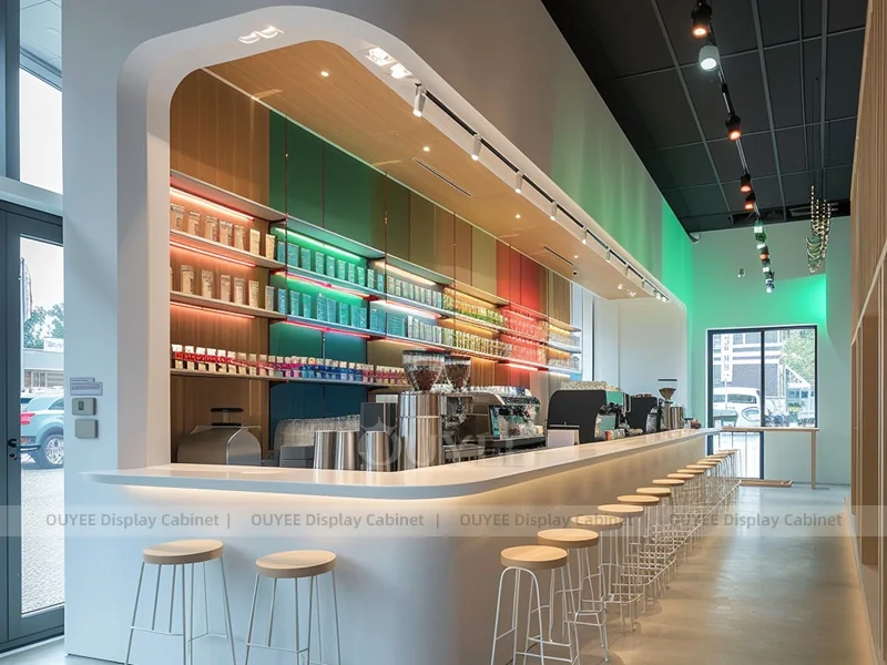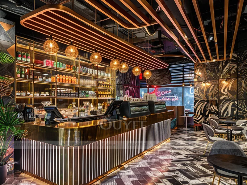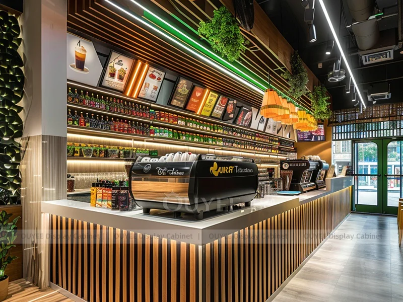 OUYEE supports coffee counter design, shop drawings, material selection, manufacturing, packing, and export delivery. We can customize the fixture according to your brand color, logo, store size, electrical planning, and installation requirements.