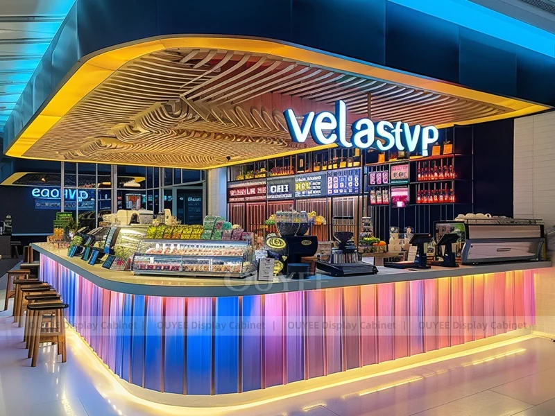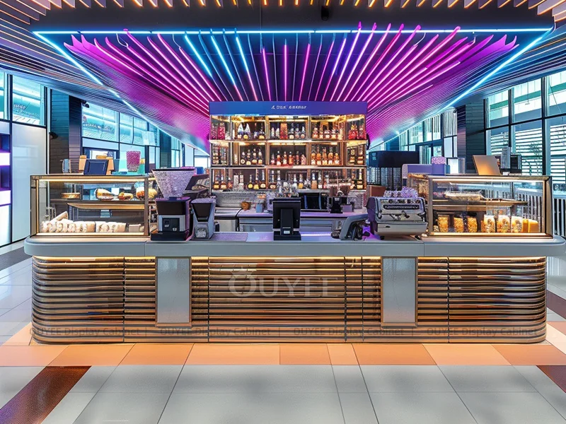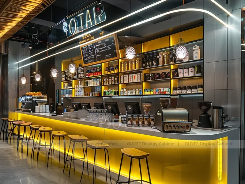 OUYEE supports coffee counter design, shop drawings, material selection, manufacturing, packing, and export delivery. We can customize the fixture according to your brand color, logo, store size, electrical planning, and installation requirements.