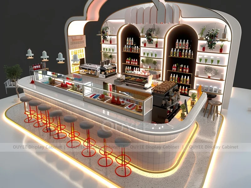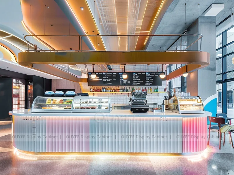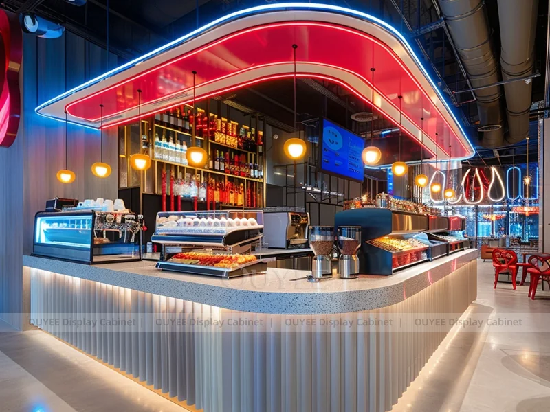 OUYEE supports coffee counter design, shop drawings, material selection, manufacturing, packing, and export delivery. We can customize the fixture according to your brand color, logo, store size, electrical planning, and installation requirements.