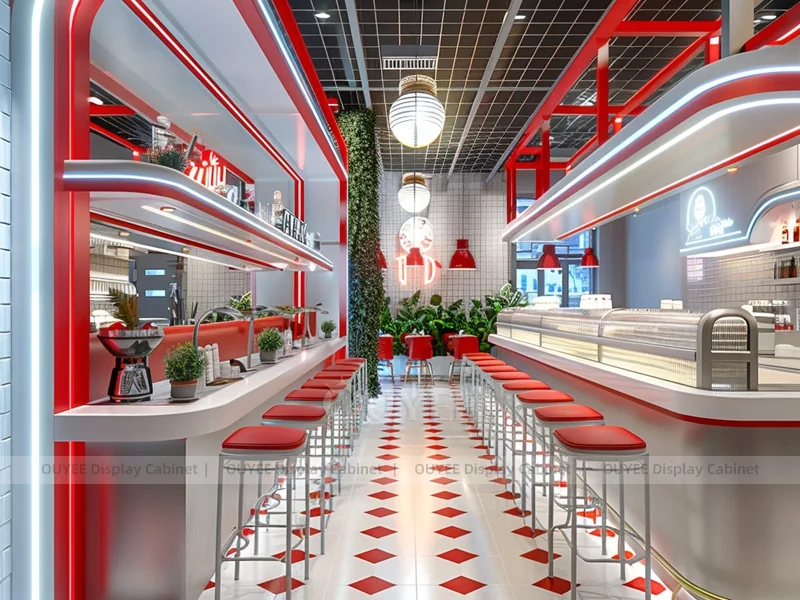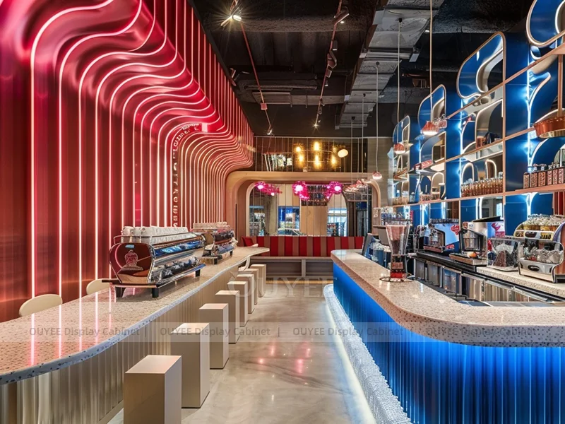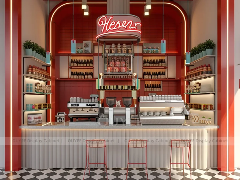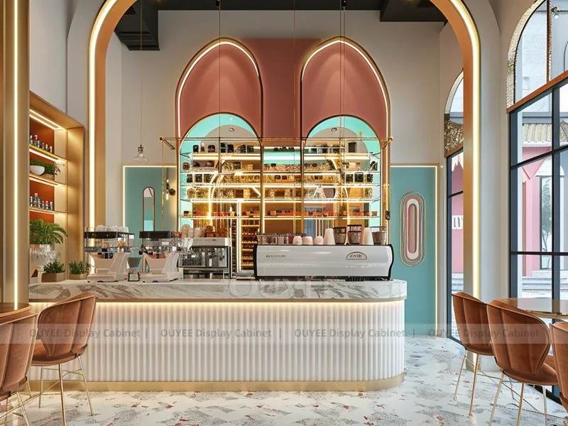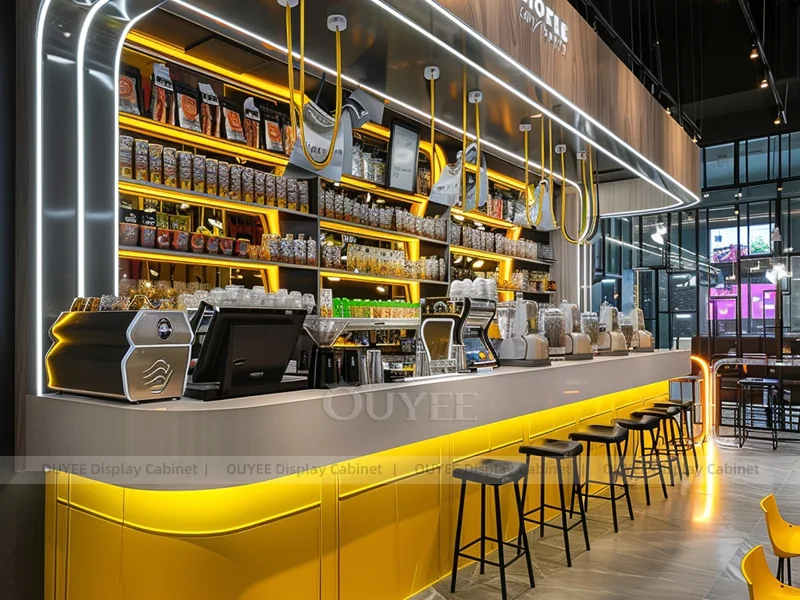 OUYEE supports coffee counter design, shop drawings, material selection, manufacturing, packing, and export delivery. We can customize the fixture according to your brand color, logo, store size, electrical planning, and installation requirements.