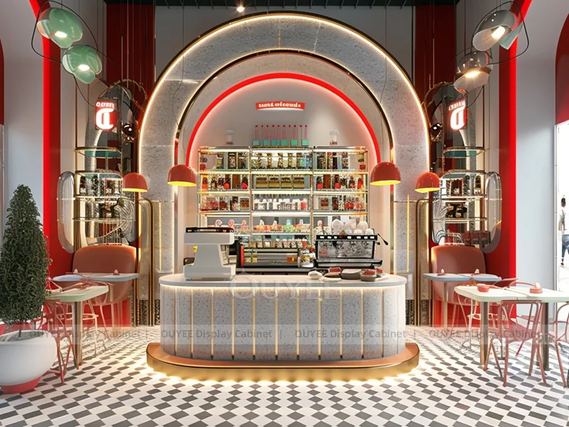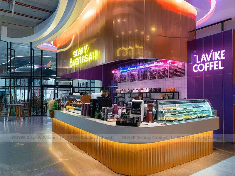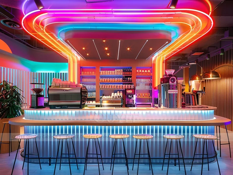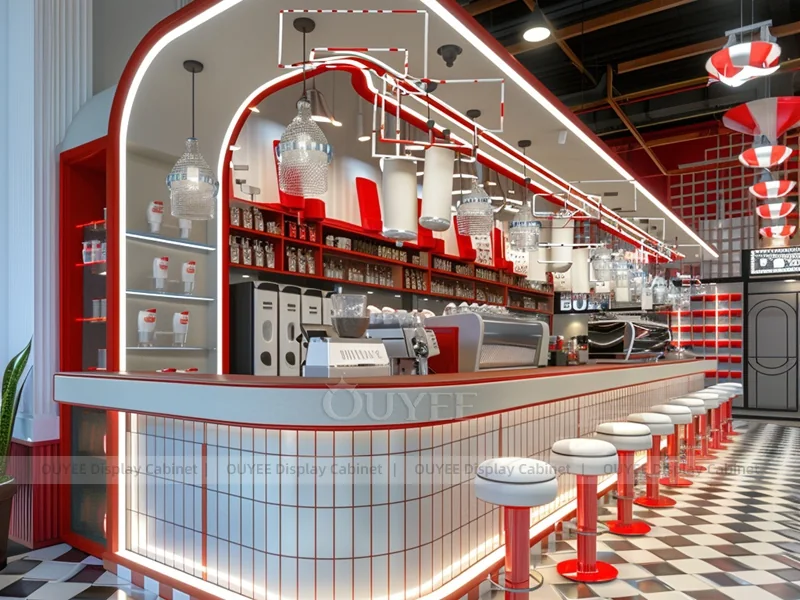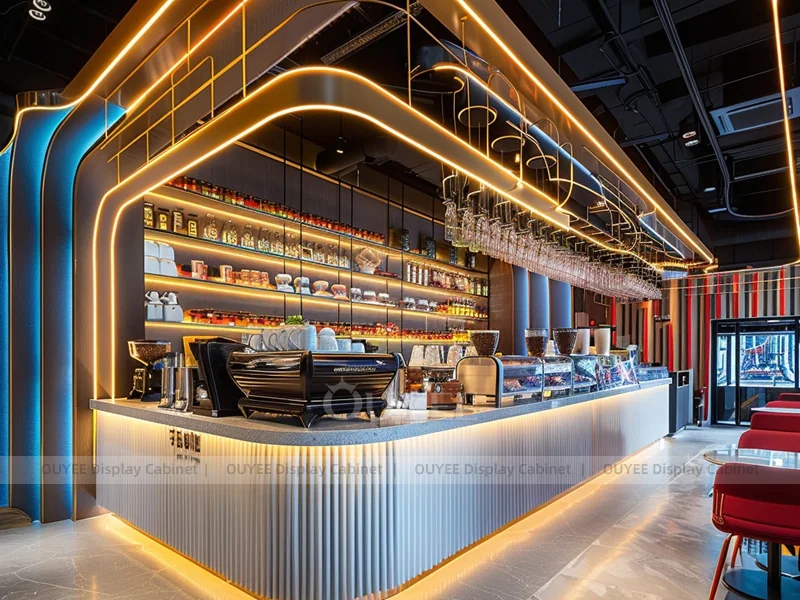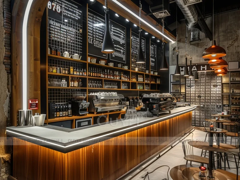 OUYEE supports coffee counter design, shop drawings, material selection, manufacturing, packing, and export delivery. We can customize the fixture according to your brand color, logo, store size, electrical planning, and installation requirements.