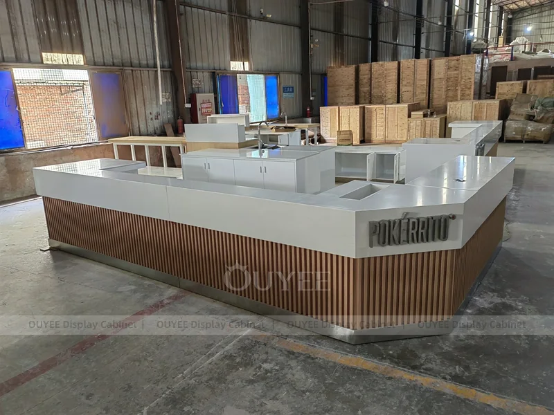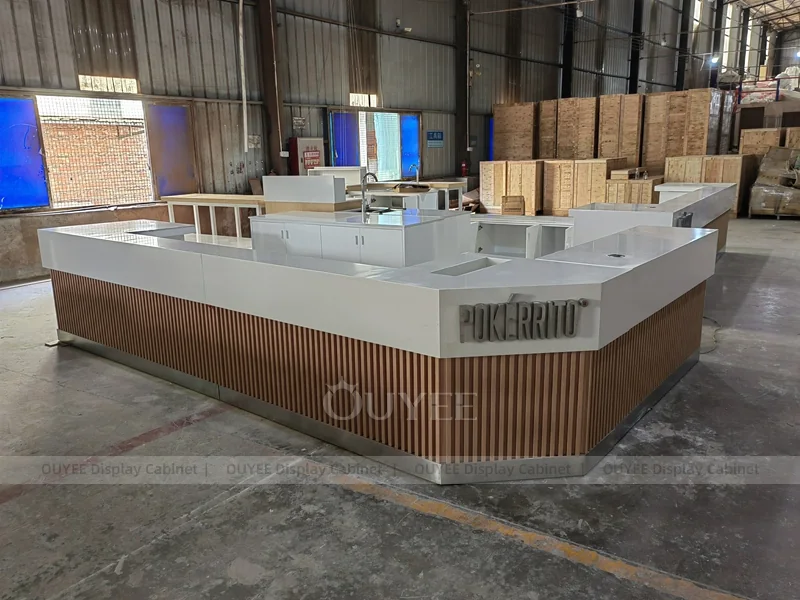 OUYEE supports coffee counter design, shop drawings, material selection, manufacturing, packing, and export delivery. We can customize the fixture according to your brand color, logo, store size, electrical planning, and installation requirements.