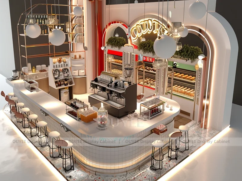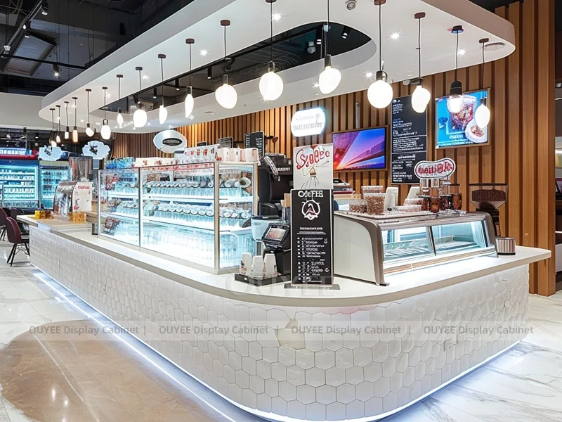OUYEE supports coffee counter design, shop drawings, material selection, manufacturing, packing, and export delivery. We can customize the fixture according to your brand color, logo, store size, electrical planning, and installation requirements.