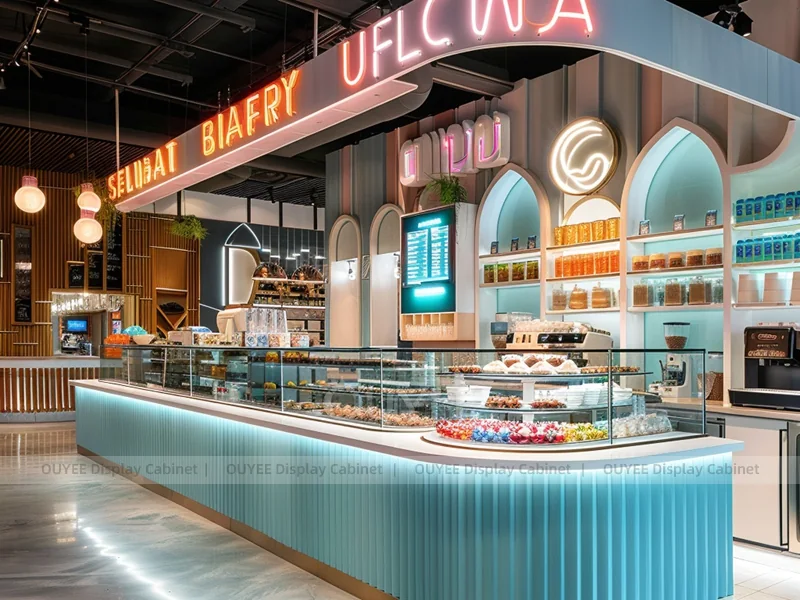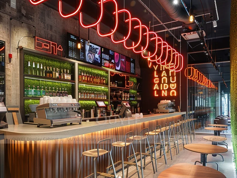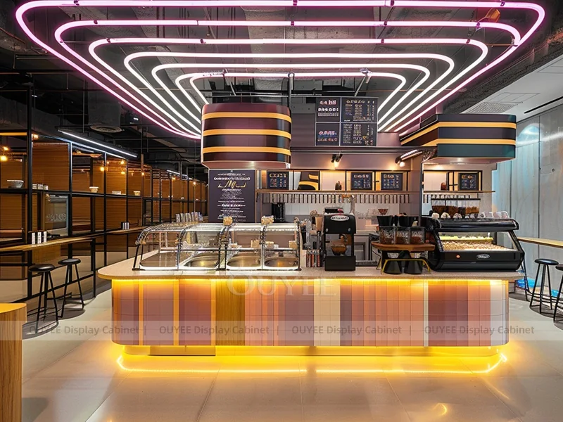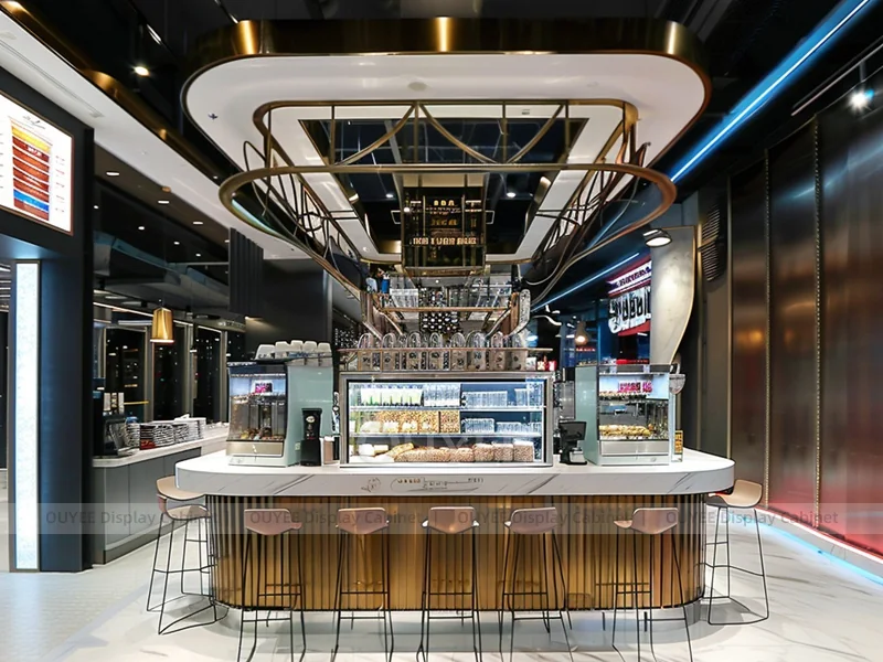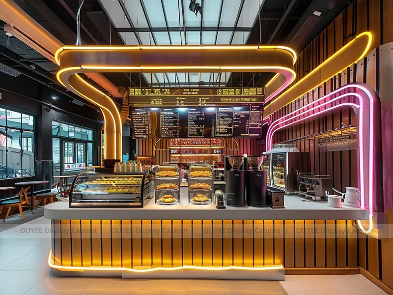 OUYEE supports coffee counter design, shop drawings, material selection, manufacturing, packing, and export delivery. We can customize the fixture according to your brand color, logo, store size, electrical planning, and installation requirements.